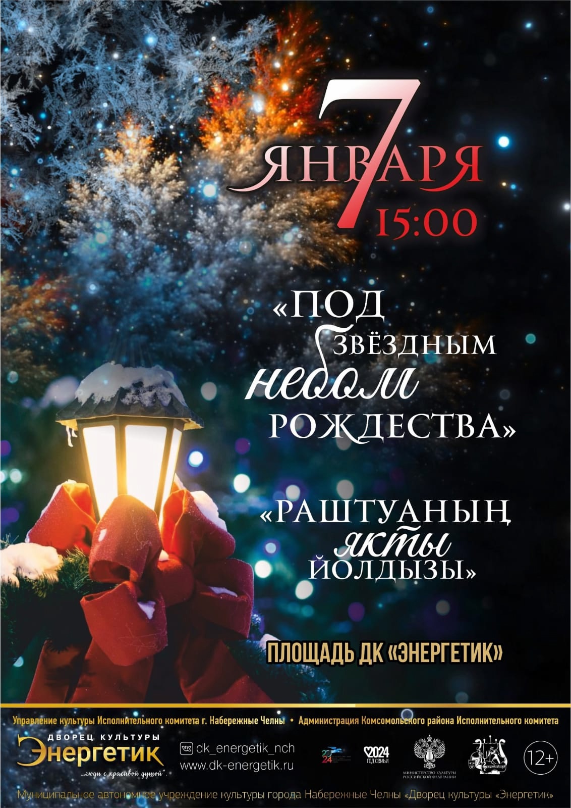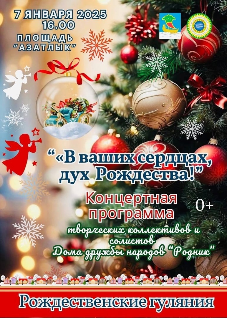 7 января в 15 и 16 часов развернутся рождественские гуляния на площади Азатлык и на площади дворца культуры «Энергетик». Концертную программу «В ваших сердцах, дух Рождества!» подарят творческие коллективы и и солисты Дома дружбы народов «Родник».