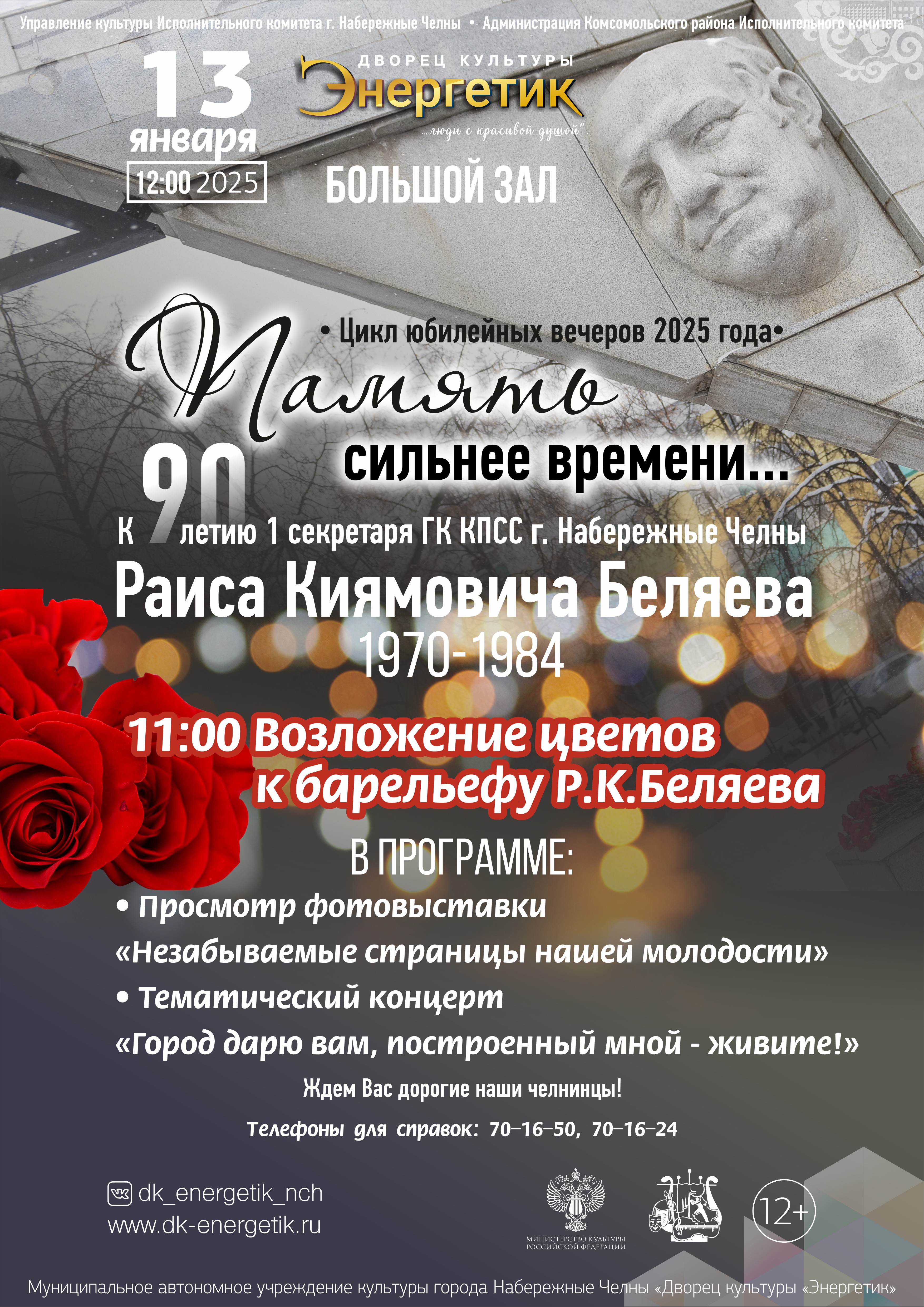 Завершит программу тематический концерт "Город дарю вам, построенный мной - живите!". Этот концерт станет символом вечной памяти и признательности Раису Беляеву за его труды на благо нашего города. В программе концерта будут представлены песни, стихи и музыкальные композиции, отражающие историю и культуру Набережных Челнов.
