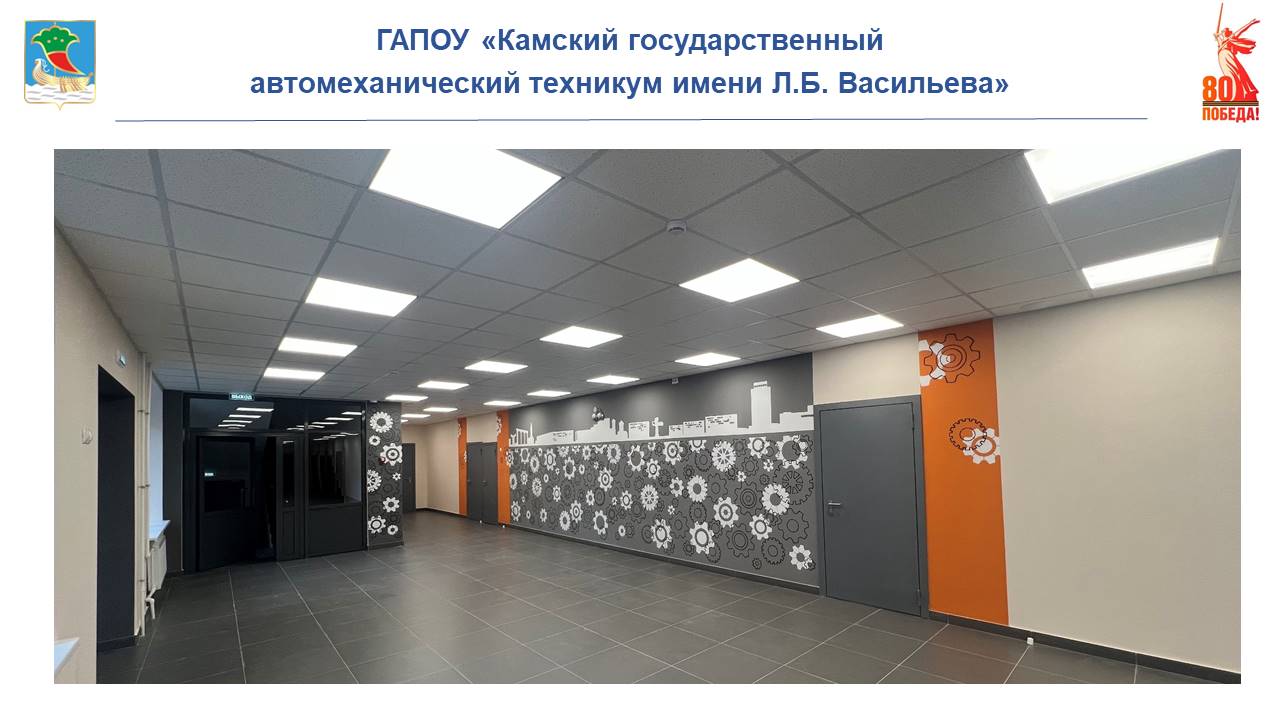 По республиканской программе капитального ремонта ресурсных центров для удовлетворения кадровых потребностей работодателей на выделенный лимит финансирования выполнен ремонт Камского государственного автомеханического техникума имени Льва Васильева. Выполнены фасадные и отделочные работы, устройство входной группы, индивидуального теплового пункта, заменены окна, двери, забор, внутренние инженерные сети, благоустройство территории и устройство спортивной площадки. Установлены новое технологическое оборудование и мебель.