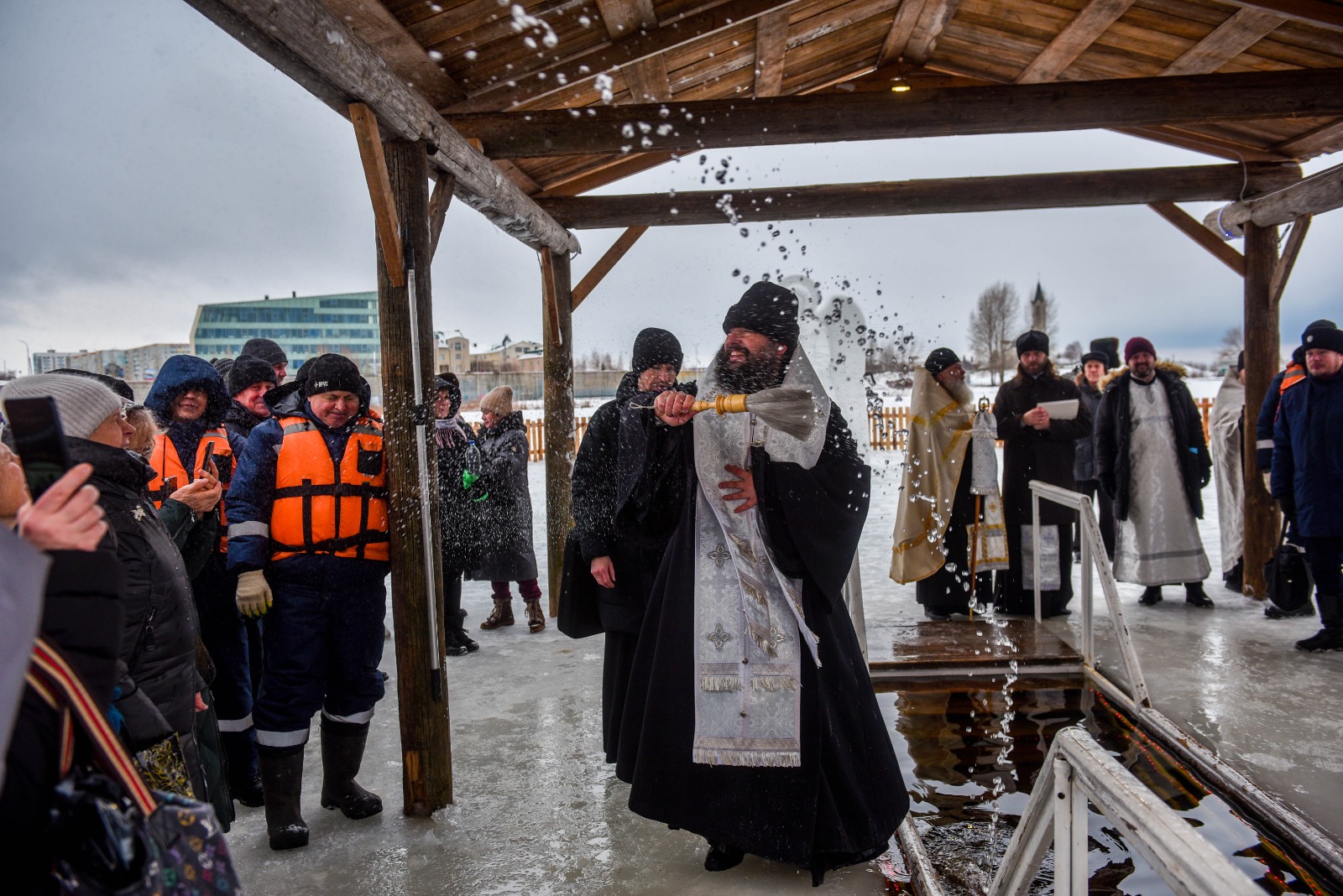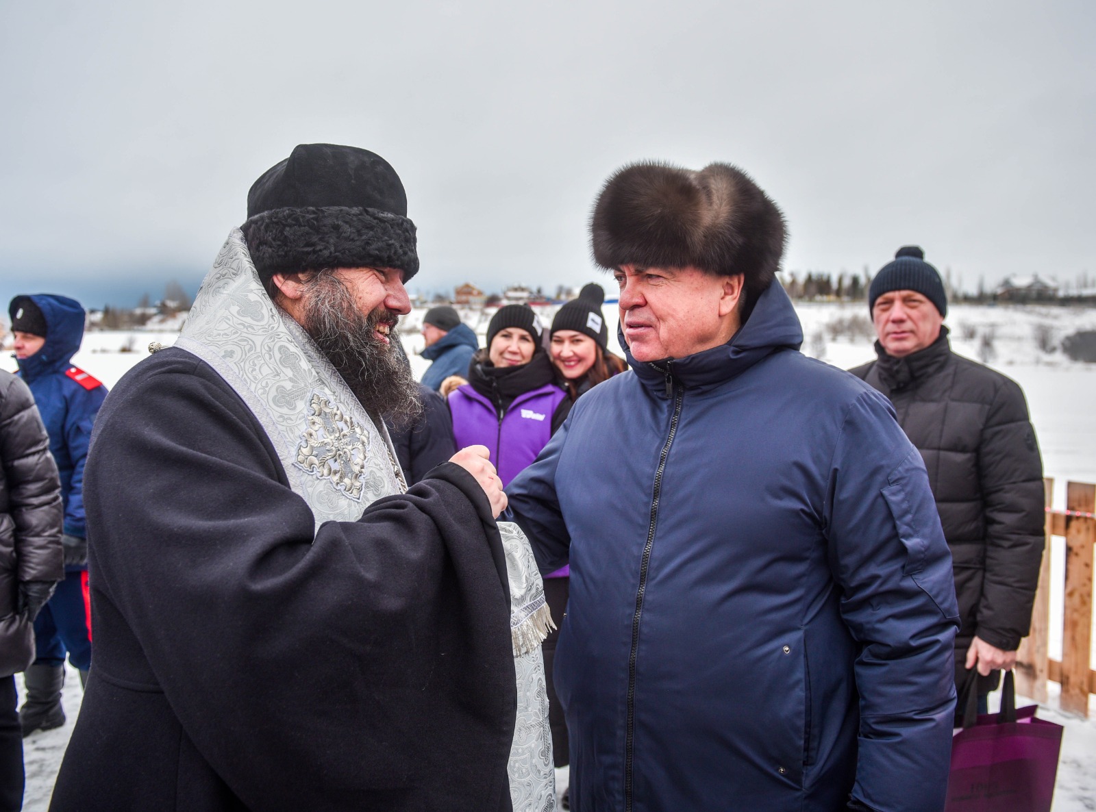 Мэр города Наиль Магдеев встретил крестный ход. Возле купели Владыкой Гавриилом было прочитано молитвенное последование, совершен обряд освящения воды.