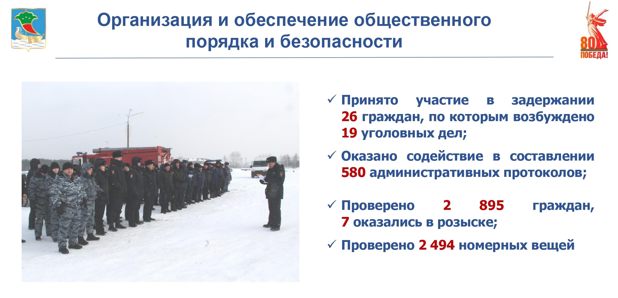 Ежедневно специалисты по организации и обеспечению общественного порядка и безопасности совместно с патрульно-постовой службой полиции охраняют общественный порядок и безопасность граждан, одними из первых оказываются на месте происшествия, принимают меры для задержания нарушителей. За отчетный период принято участие в задержании по подозрению в совершении преступления 26 граждан, по которым возбуждено 19 уголовных дел.  Оказано содействие в составлении 580 административных протоколов по КоАП РФ. Осуществлены проверки граждан, в результате которых из 2 895 проверенных лиц семь находились в розыске.
