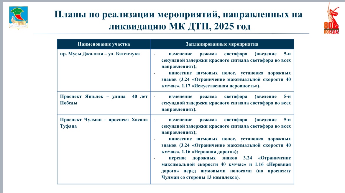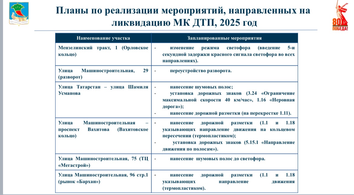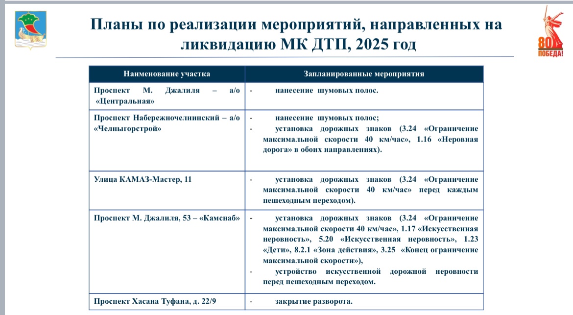 Для обеспечения безопасности планируется установить 54 дорожных знака и обустроить искусственные дорожные неровности на 14 участках проспектов: Мусы Джалиля – улица Батенчука, Яшьлек – улица 40 лет Победы, Чулман – Хасана Туфана, Набережночелнинский – а/о «Челныгорстрой», Хасана Туфана, д. 22/9- Мензелинский тракт, 1 (Орловское кольцо), улица Машиностроительная, 29, улица Татарстан – улица Шамиля Усманова, улица Машиностроительная – проспект Вахитова (Вахитовское кольцо), улица Машиностроительная, 75, улица Машиностроительная, 96, Мусы Джалиля – а/о «Центральная», Набережночелнинский – а/о «Челныгорстрой»,проспект Хасана Туфана, д. 22/9, улица КАМАЗ-Мастер, 11, Мусы Джалиля, 53 – "Камснаб".