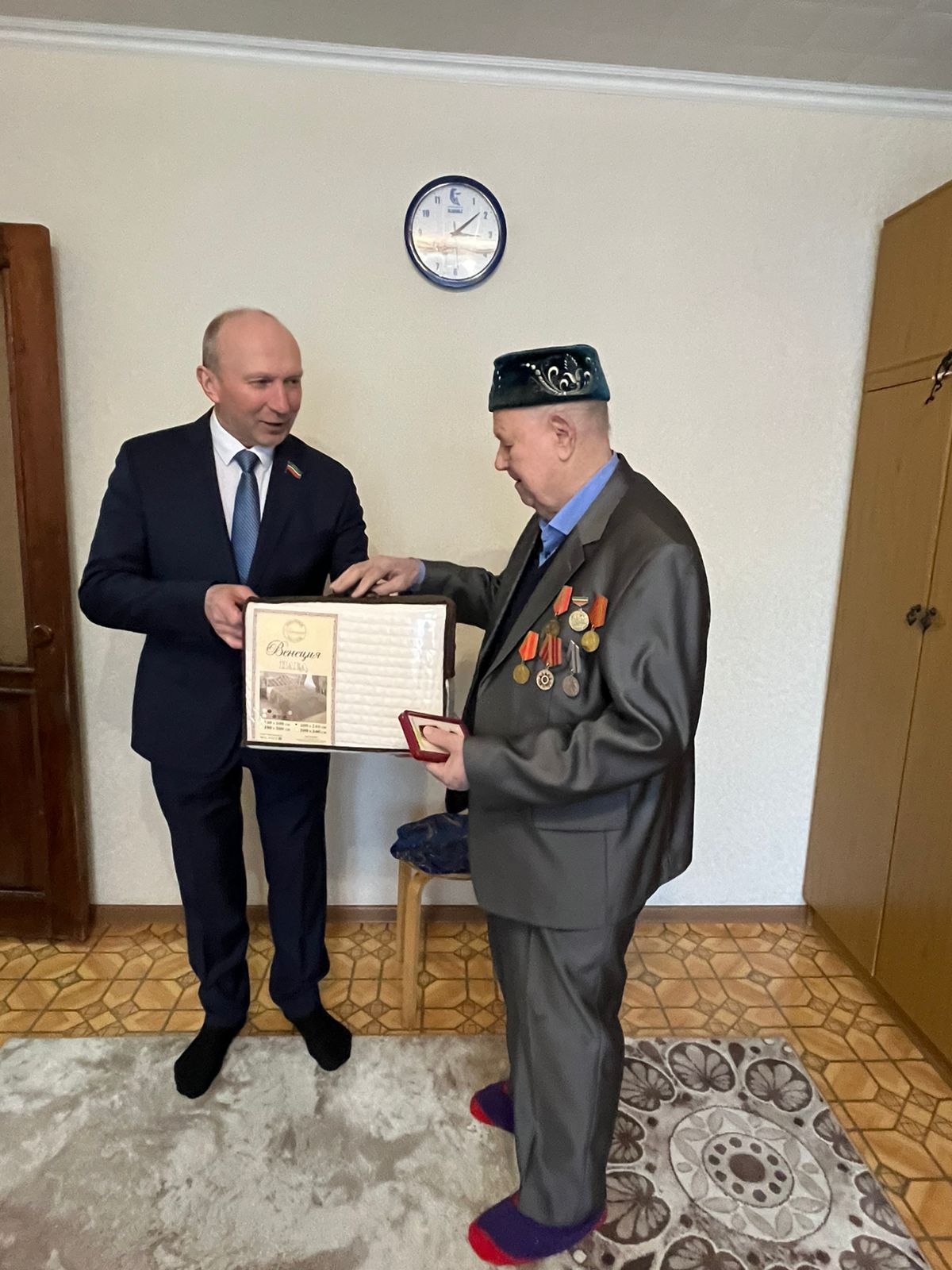 В Автозаводском районе поздравляют ветеранов ВОВ и вручают юбилейные медали. Депутат Государственного Совета Республики Татарстан Владимир Чагин вручил ветерану Великой Отечественной войны, труженику тыла Ильгизу Абрамовичу Галееву юбилейную медаль «80 лет Победы в Великой Отечественной войне 1941-1945 гг.».