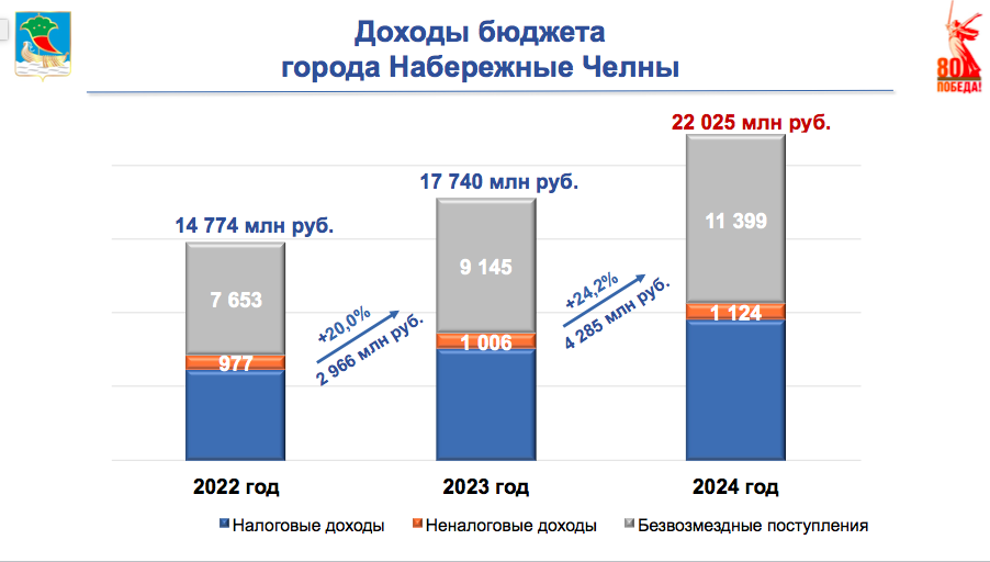 По итогам 2024 года в бюджет города Набережные Челны поступили доходы в сумме 22 млрд 25 млн рублей, в том числе собственные доходы – 10 млрд 626 млн рублей и безвозмездные поступления – 11 млрд 399 млн рублей. К уровню прошлого года доходы выросли на 4 млрд 285 млн рублей в результате роста собственных доходов на 2 млрд 31 млн рублей и безвозмездных поступлений на 2 млрд 254 млн рублей. Плановые назначения по налоговым и неналоговым доходам по итогам 2024 года исполнены на 141%, перевыполнение составило 3 млрд 80 млн рублей.