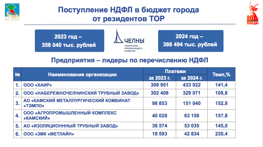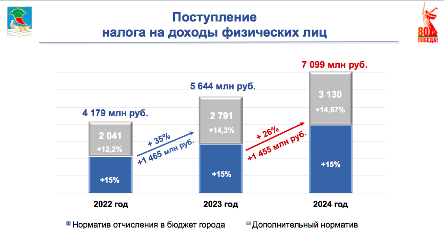 Налог на доходы физических лиц в городской бюджет поступил в объеме 7 млрд 99 млн рублей. Утвержденные плановые показатели по налогу исполнены на 148%. К уровню 2023 года НДФЛ поступил с увеличением на 1 млрд 455 млн рублей. Прирост по налогу на доходы физических лиц достигнут за счет повышения заработной платы по предприятиям и организациям города в среднем на 127%; выплат дивидендов на 1 млрд 261 млн рублей и увеличением на 4 280 рабочих мест.