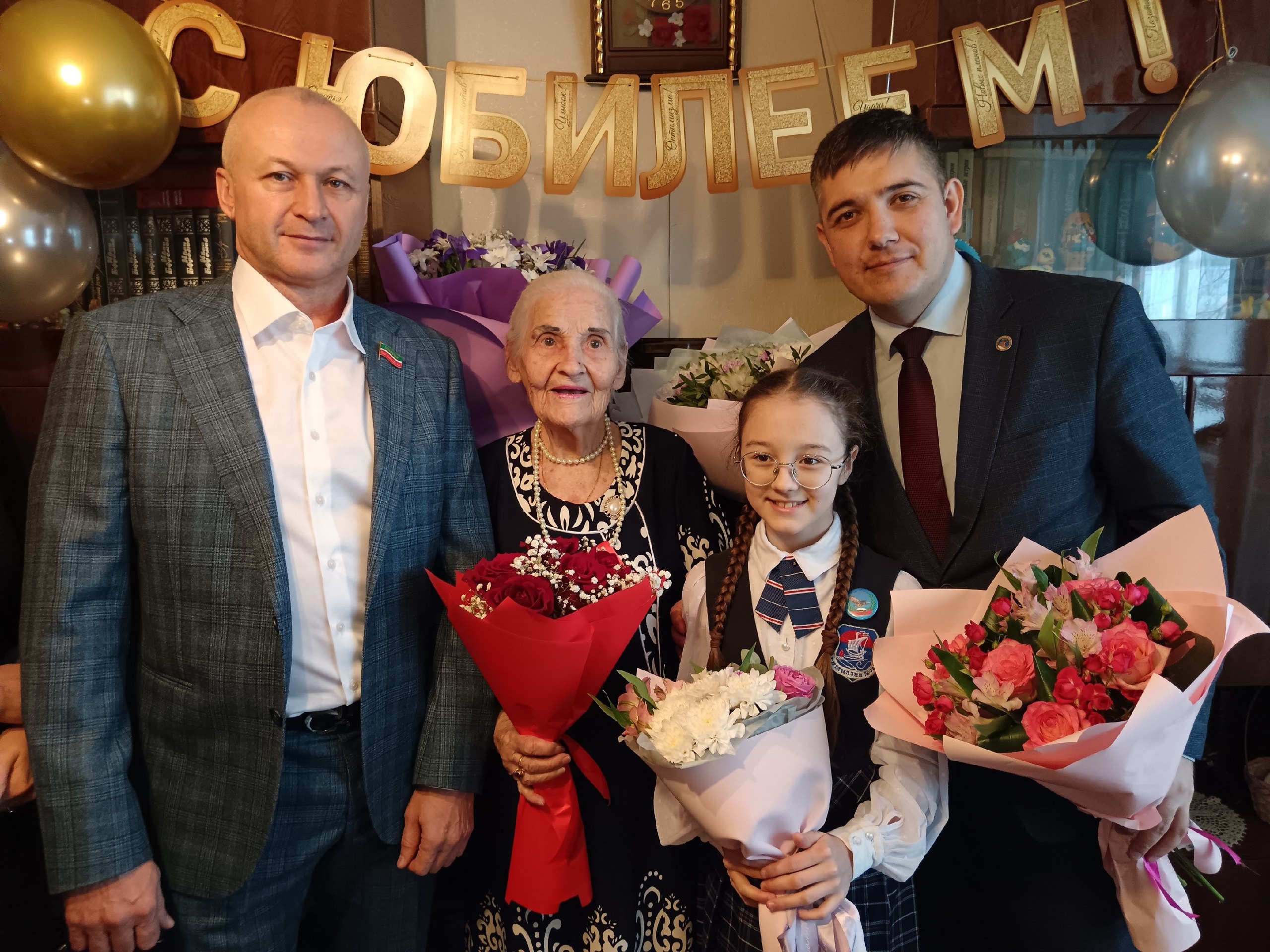 Ветерана поздравили глава администрации Центрального района Фидарис Хабибуллин, депутат Государственного Совета Республики Татарстан Олег Николаев, заместитель директора управляющей компании «Паритет» Елена Гараева, председатель ТОС «Изумрудный 44» Людмила Семенова, ученица гимназии №76 Амилия Сабирова.