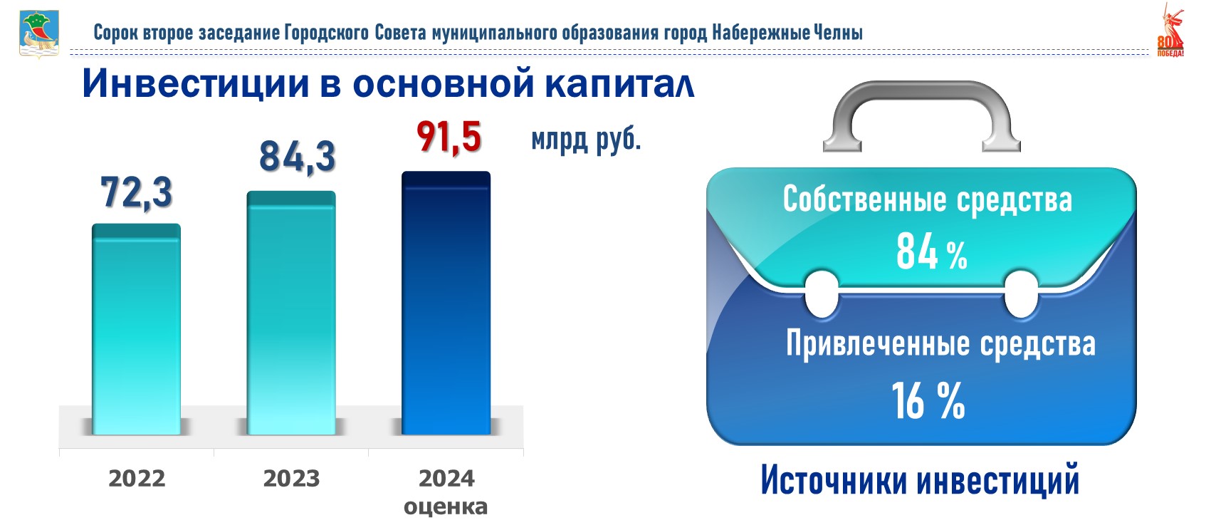 Состояние экономики города характеризует объем привлеченных инвестиций, который по итогам года оценивается в сумме 91,5 млрд рублей. Важно, что за последние годы наблюдается динамика роста этого показателя.