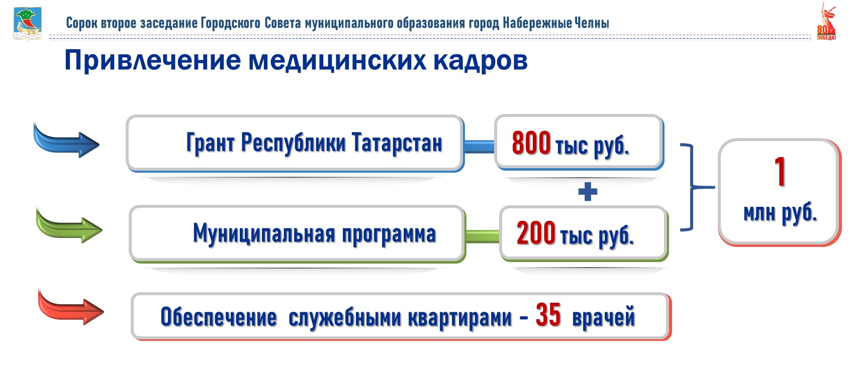 В настоящее время 35 высококвалифицированных врачей, которые приехали в Набережные Челны, обеспечены служебными квартирами. За все время действия программы по предоставлению оборотного служебного жилья Исполнительным комитетом предоставлены квартиры 46 врачам. В прошлом году 51 выпускник поступил на специалитет и 33 врача – в ординатуру.