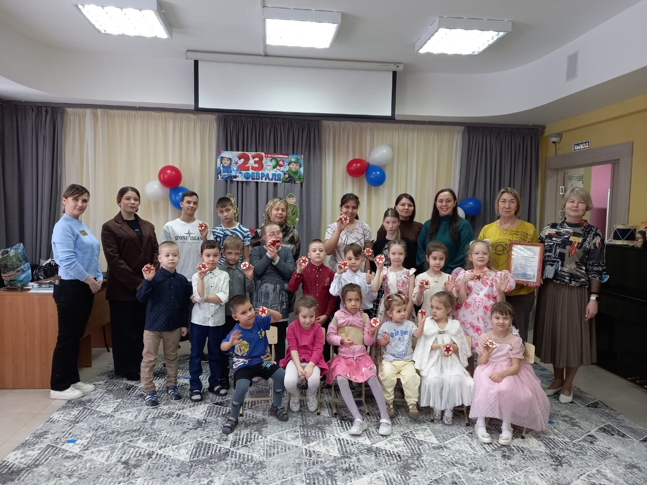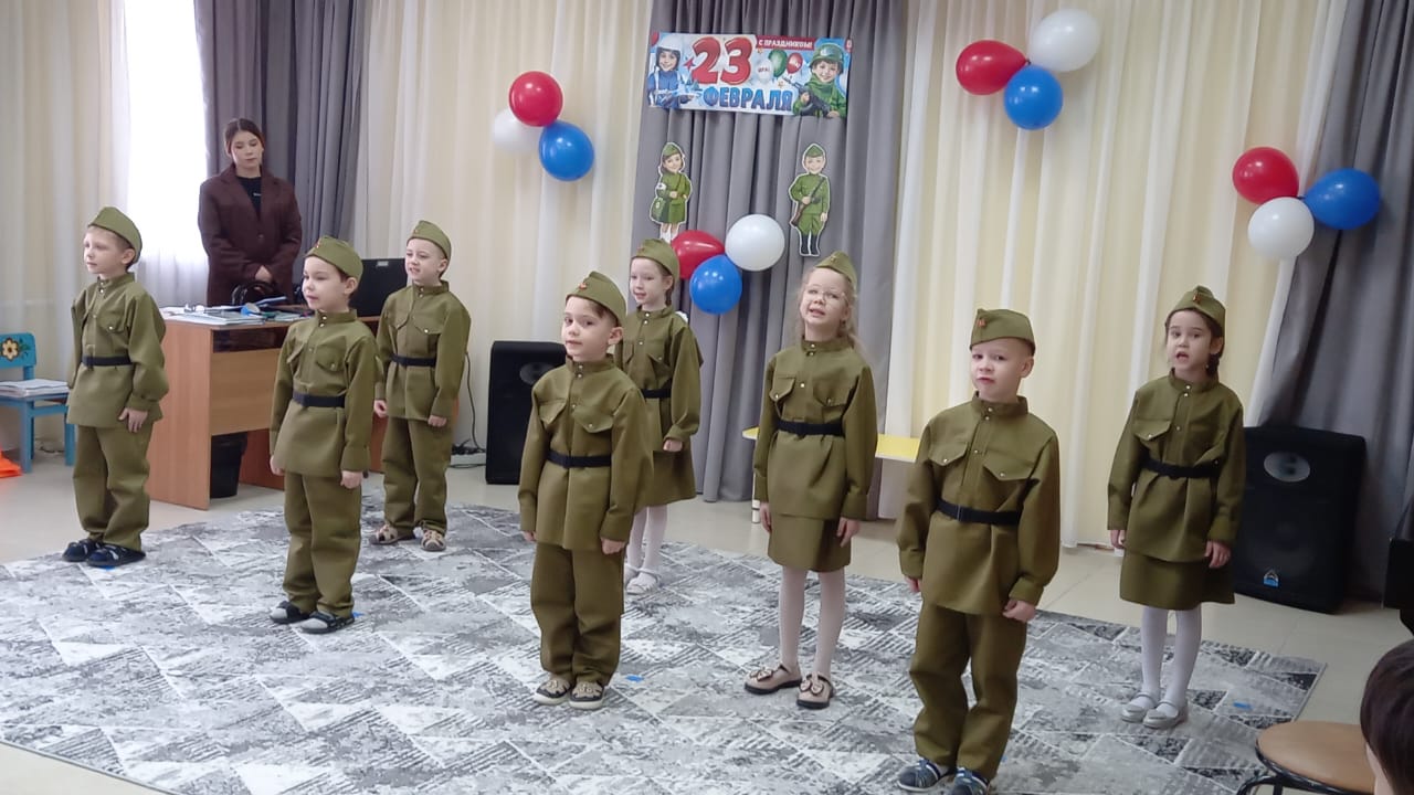 Воспитанники детского сада № 72 «Антошка» посетили реабилитационный центр «Солнышко» с праздничным концертом, посвящённым Дню защитника Отечества. Юные артисты спели военные песни, прочли стихи и станцевали. В конце мероприятия для всех присутствующих организован совместный флэш-моб и провели мастер класс, на котором изготавливали «Военную звезду».