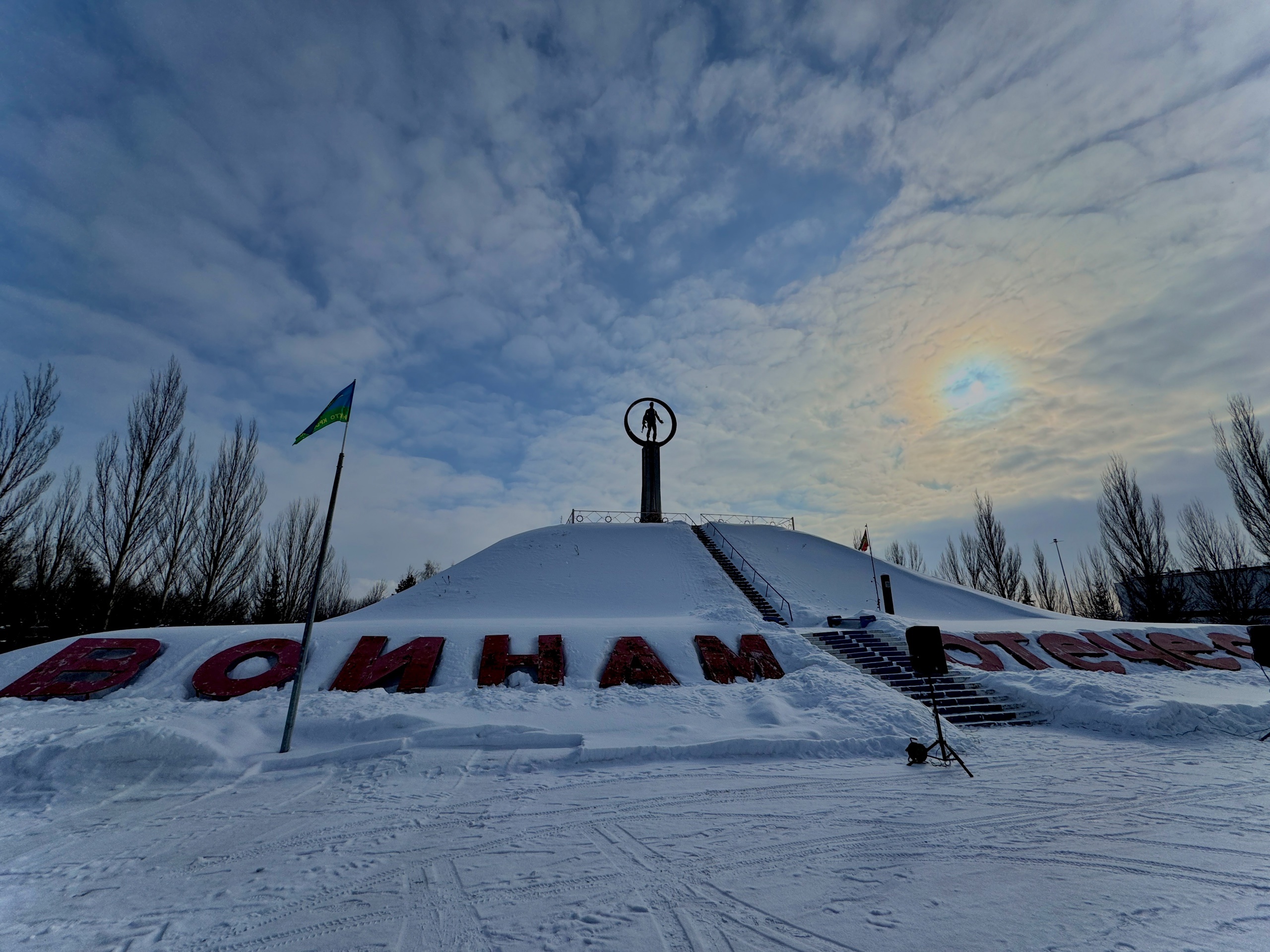 Собравшиеся почтили память всех героев, кто отдал свою жизнь за светлое небо над головой минутой молчания.Завершилась церемония возложением цветов к памятнику "Воинам Отечества".