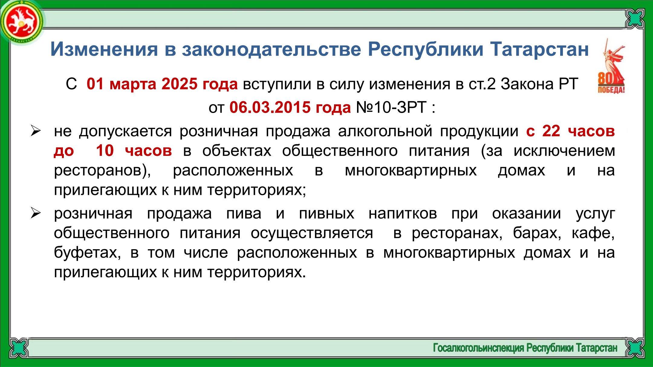 С 1 марта 2025 года запрещена продажа алкоголя в объектах общественного питания: в жилых домах с 22:00 до 10:00. Разрешено продавать пиво и пивные напитки в ресторанах, барах и кафе. В 2024 году совместно с полицией изъято 4175,1 литра контрафактной продукции.