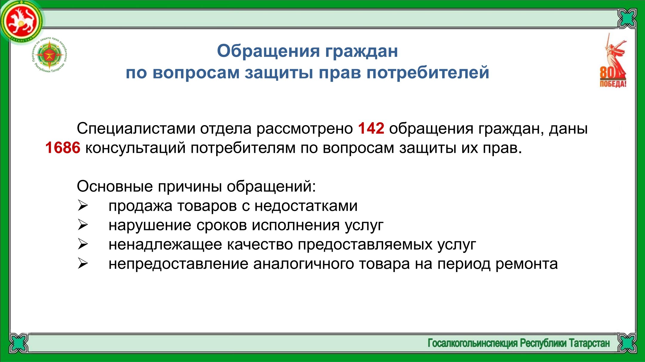 За 2024 год территориальным органом рассмотрено 142 обращения граждан по фактам нарушений законодательства Российской Федерации в области защиты прав потребителей. Проведены 1686 консультаций потребителей по вопросам защиты их прав. В отчётном периоде потребители жаловались на продажу товаров с недостатками, нарушение сроков исполнения услуг, ненадлежащее качество предоставляемых услуг, непредоставление аналогичного товара на период ремонта.