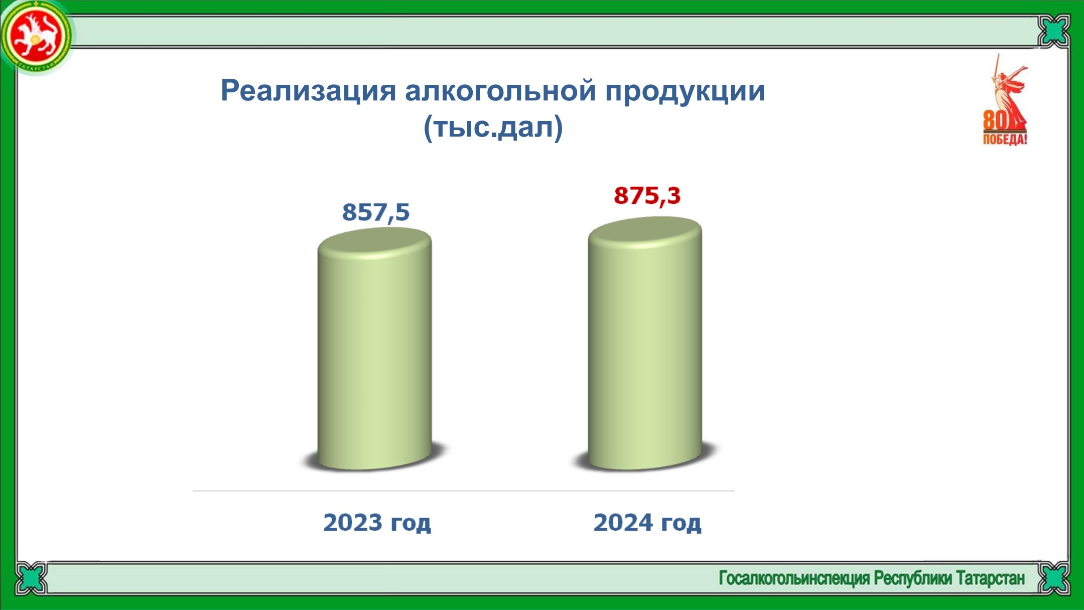 Лицензионными торговыми объектами города Набережные Челны в 2024 году реализовано 875,3 тыс. дал алкогольной продукции, что составляет 102% к уровню прошлого года.