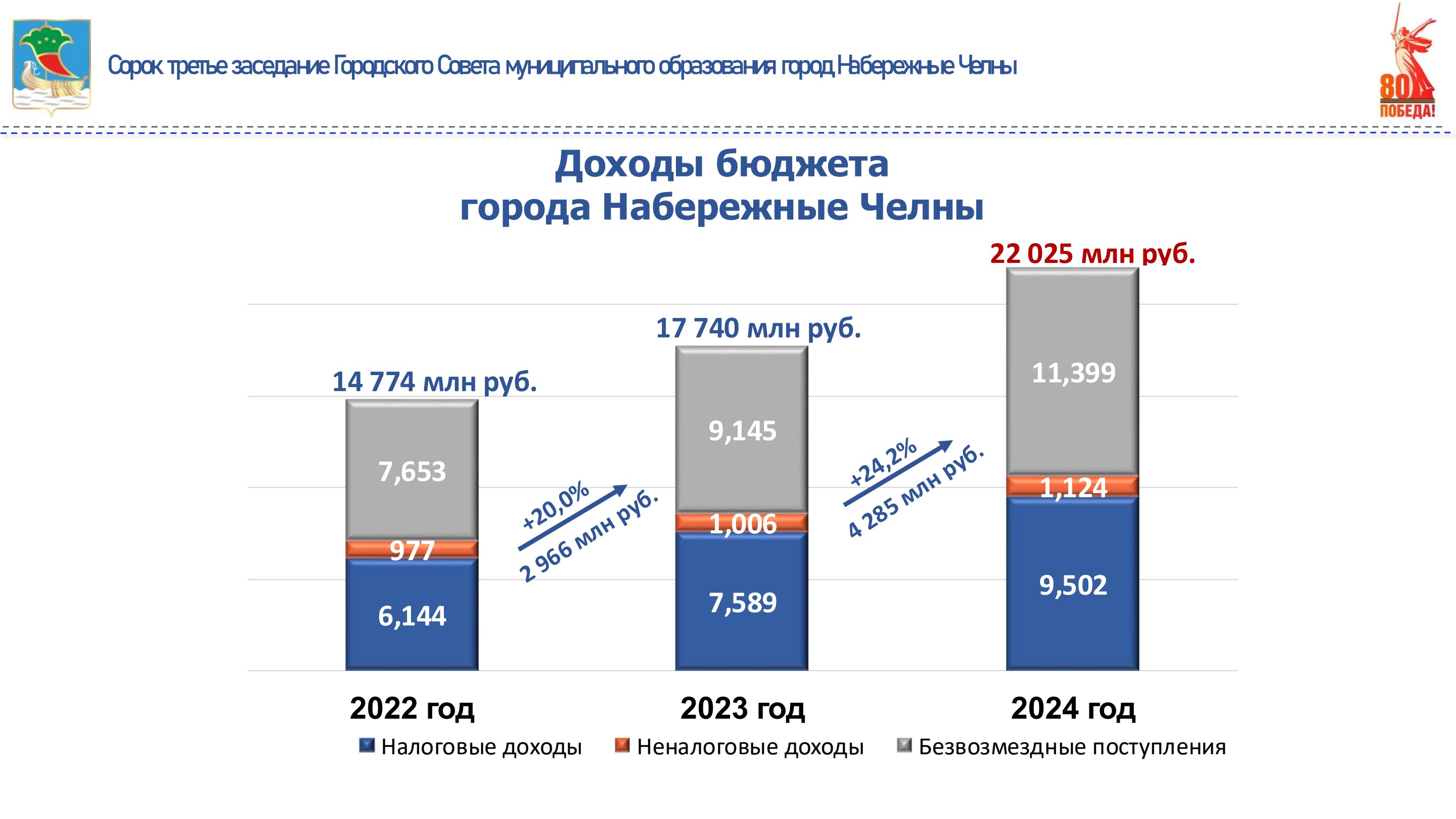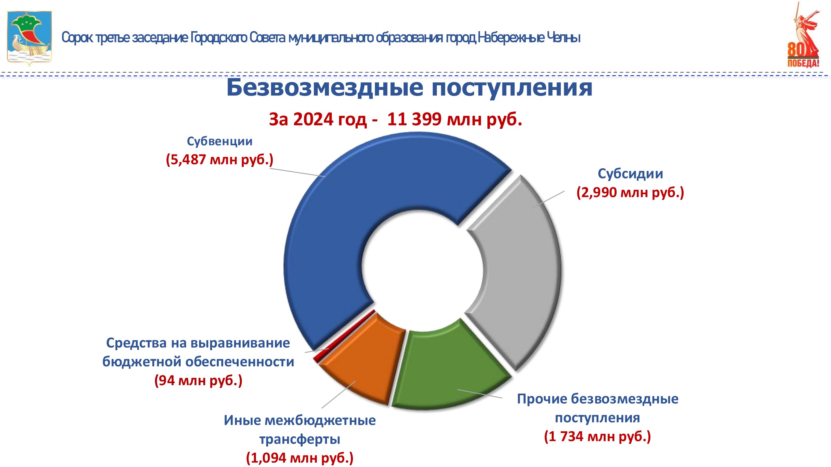 бюджета города влияет увеличение объема безвозмездных поступлений. В 2024 году в бюджет города поступило 11 млрд 399 млн