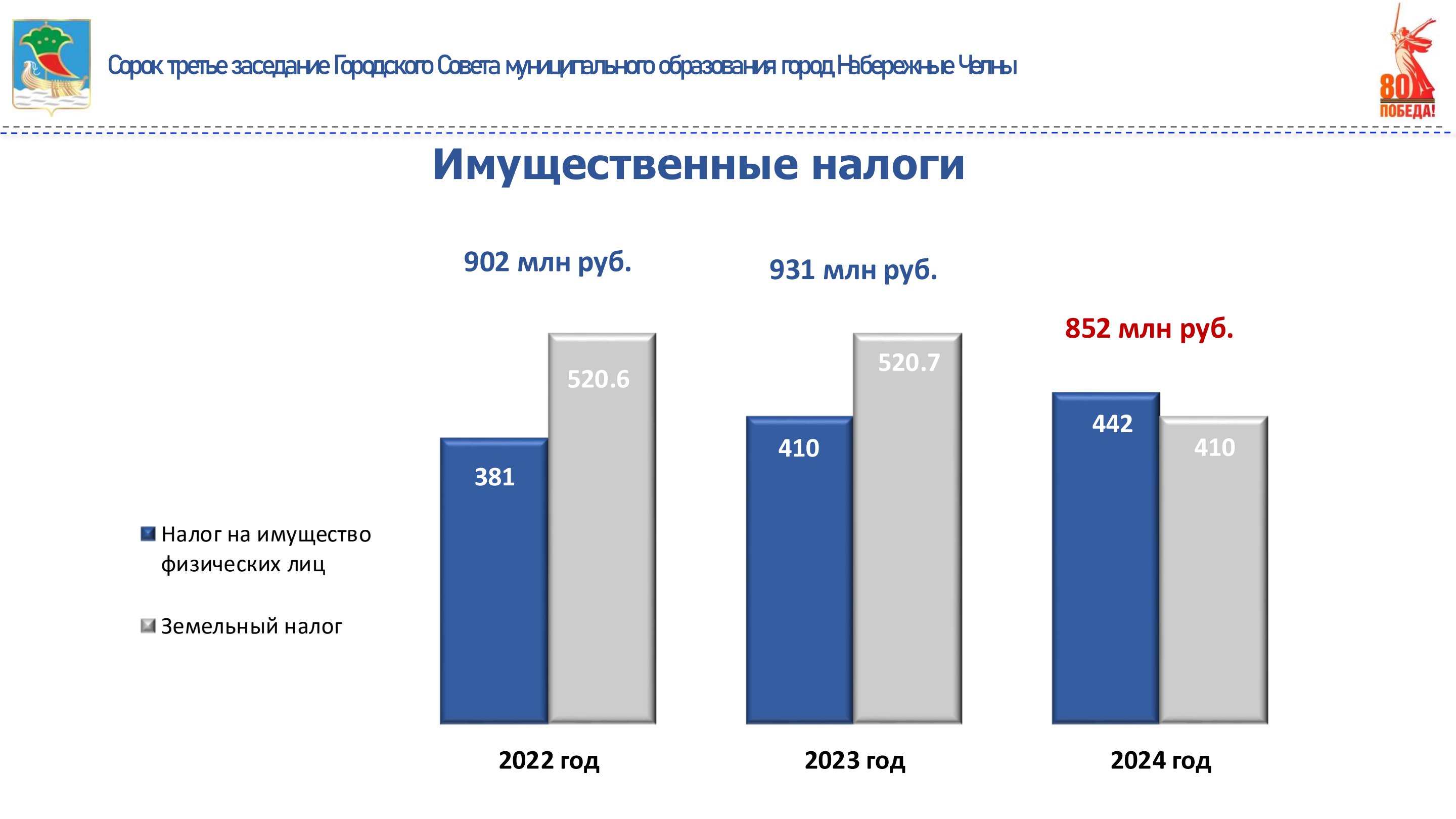 Сумма поступивших налогов на имущество составила 852 млн рублей, из них налог на имущество физических лиц – 442 млн рублей и земельный налог в сумме 410 млн рублей. Уменьшение поступлений к 2023 году связано с переоценкой кадастровой стоимости земельных участков.