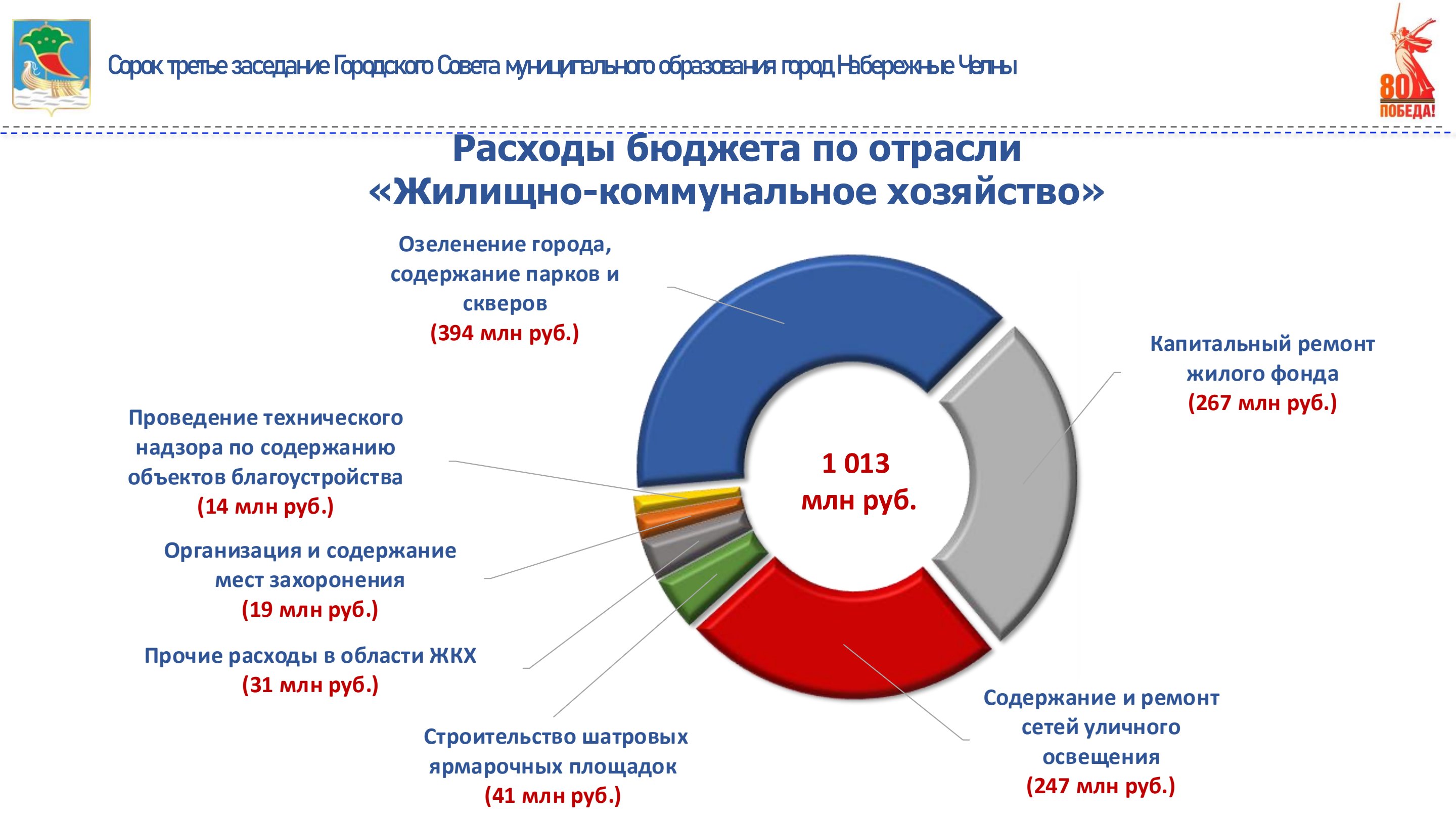 Расходы по отрасли «Жилищно-коммунальное хозяйство» профинансированы в сумме 1 млрд 13 млн рублей. На проведение капитального ремонта многоквартирных домов за счет средств бюджета города выделено 267 млн рублей. Профинансированы расходы на уличное освещение 247 млн рублей, из них на оплату электроэнергии уличного освещения направлено 121 млн рублей,на содержание сетей освещения – 126 млн рублей. На содержание, озеленение и благоустройство территории города направлено 394 млн рублей.