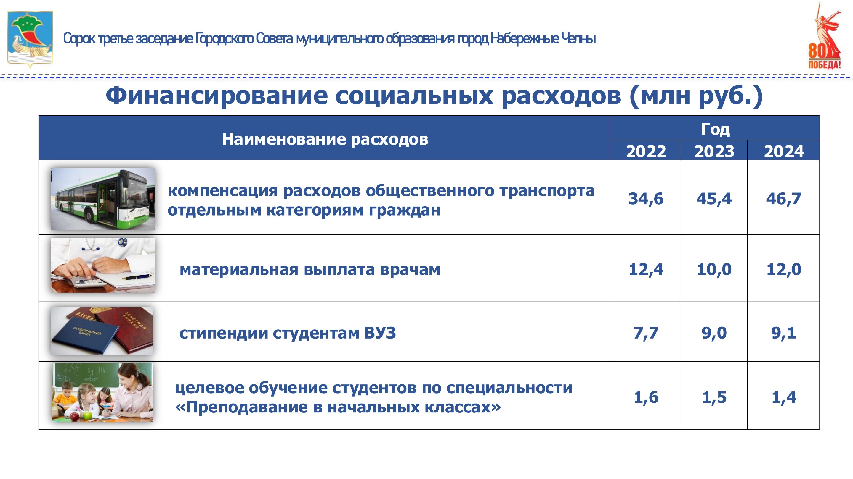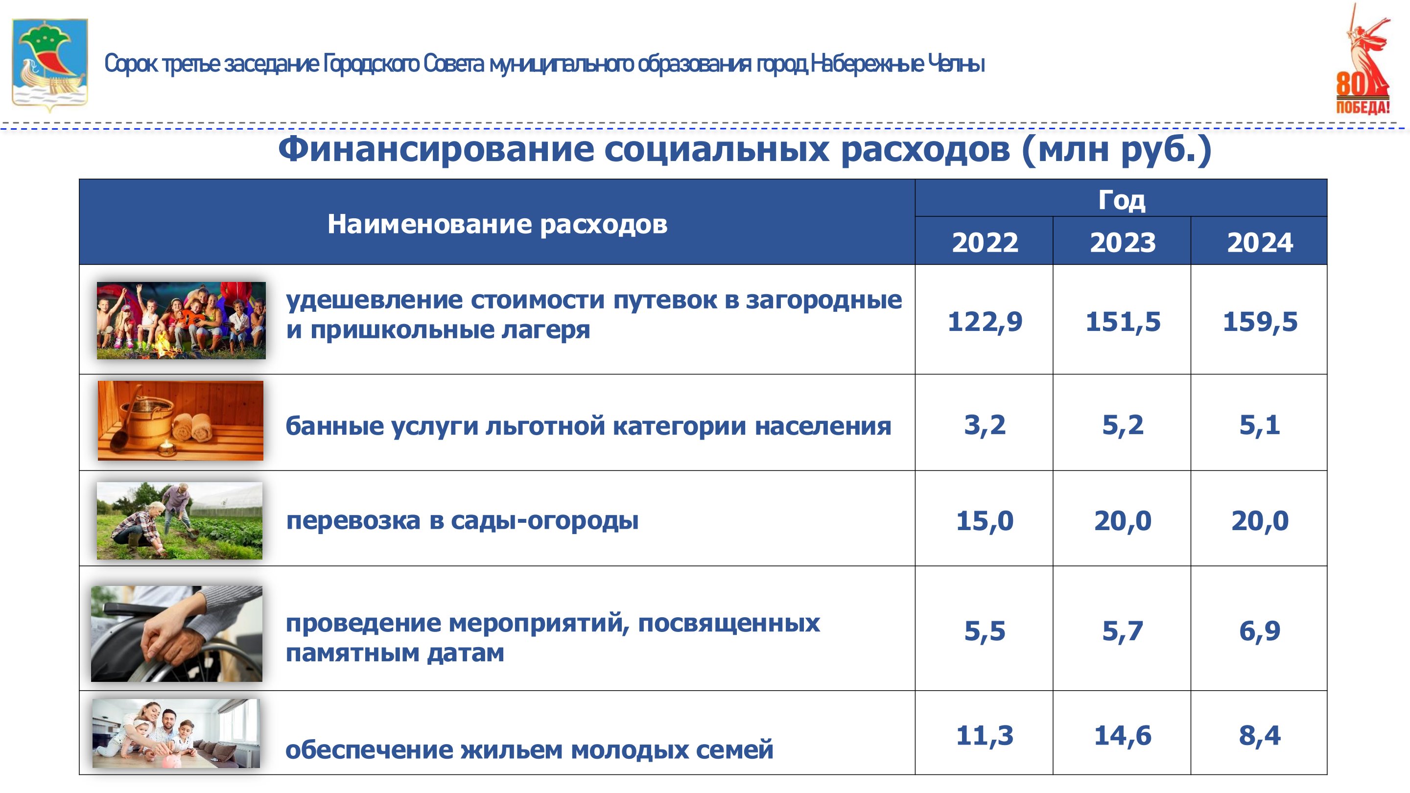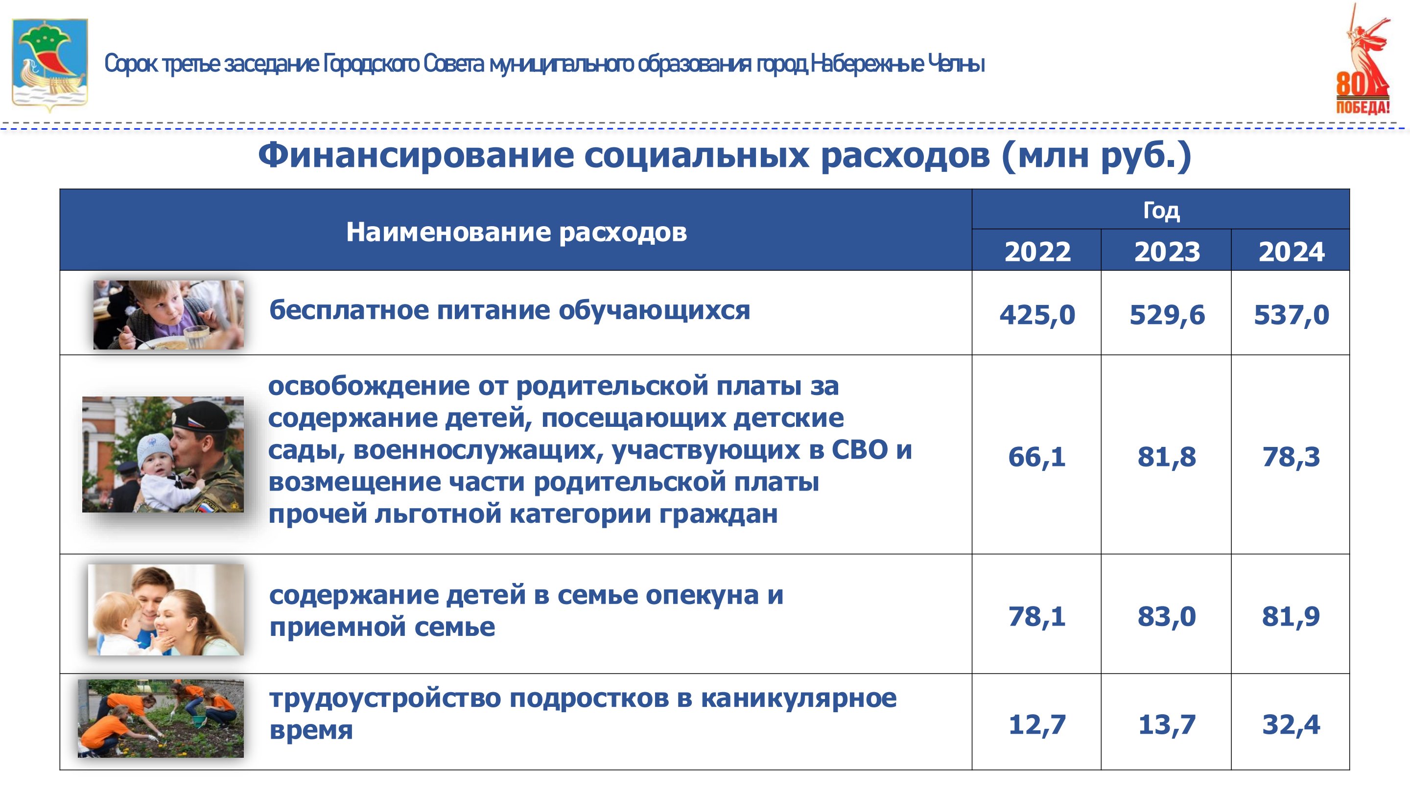 За 2024 год на социальную политику выделено 999 млн рублей, в том числе на организацию бесплатного питания в школах для детей участников специальной военной операции, детей инвалидов, с ограниченными возможностями здоровья, из многодетных семей, учеников 1-4 классов – 537 млн рублей; на освобождение от родительской платы за содержание в детских садах детей участников специальной военной операции и возмещение части родительской платы прочей льготной категории граждан – 78 млн рублей; на содержание детей в семье опекуна и приемной семье – 82 млн рублей; на трудоустройство подростков в каникулярное время – 32 млн рублей; дотацию на удешевление стоимости путевок в загородные и пришкольные лагеря и предоставление бесплатных путевок детям участников специальной военной операции – 160 млн рублей; на оказание банных услуг и перевозку в сады-огороды льготной категории населения – 25 млн рублей. Подробная детализация представлена на слайде.