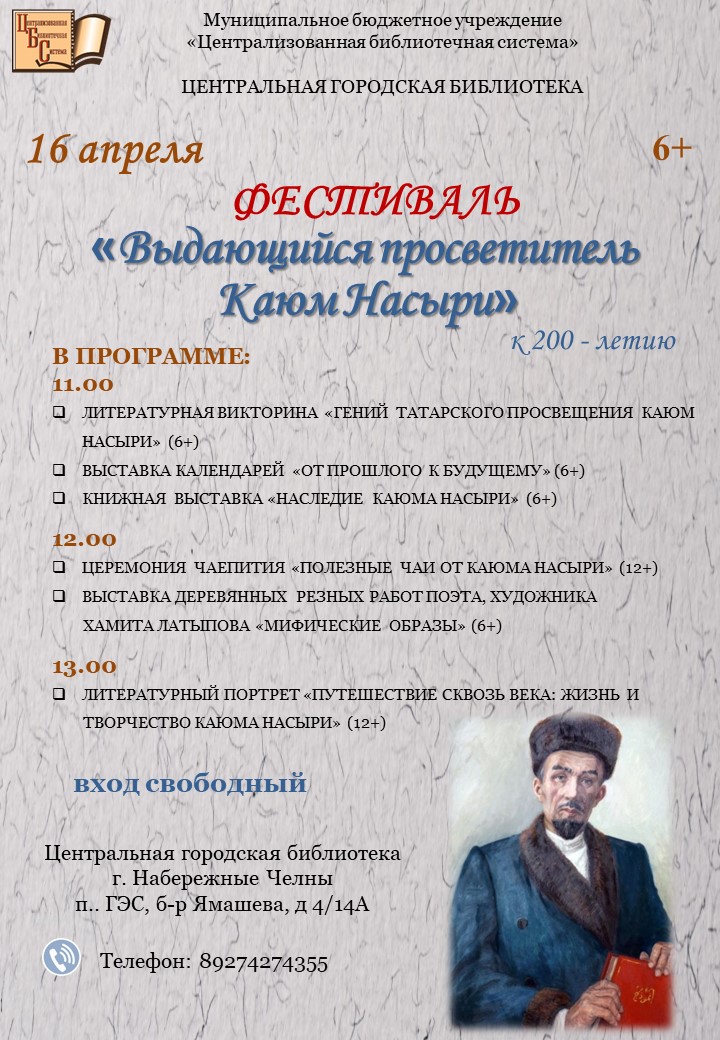 В Центральной городской библиотеке Набережных Челнов пройдет городской фестиваль «Выдающийся просветитель Каюм Насыри». Это мероприятие приурочено к 200-летию известного татарского ученого-энциклопедиста, поэта и просветителя.