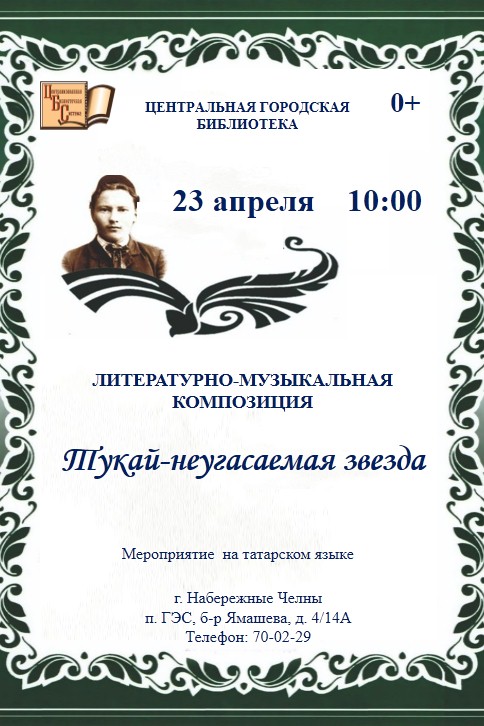 23 апреля сотрудники Центральной городской библиотеки приглашают всех желающих на литературно-музыкальную композицию «Тукай – сүнмәс йолдыз ул» //«Тукай – неугасаемая звезда».
