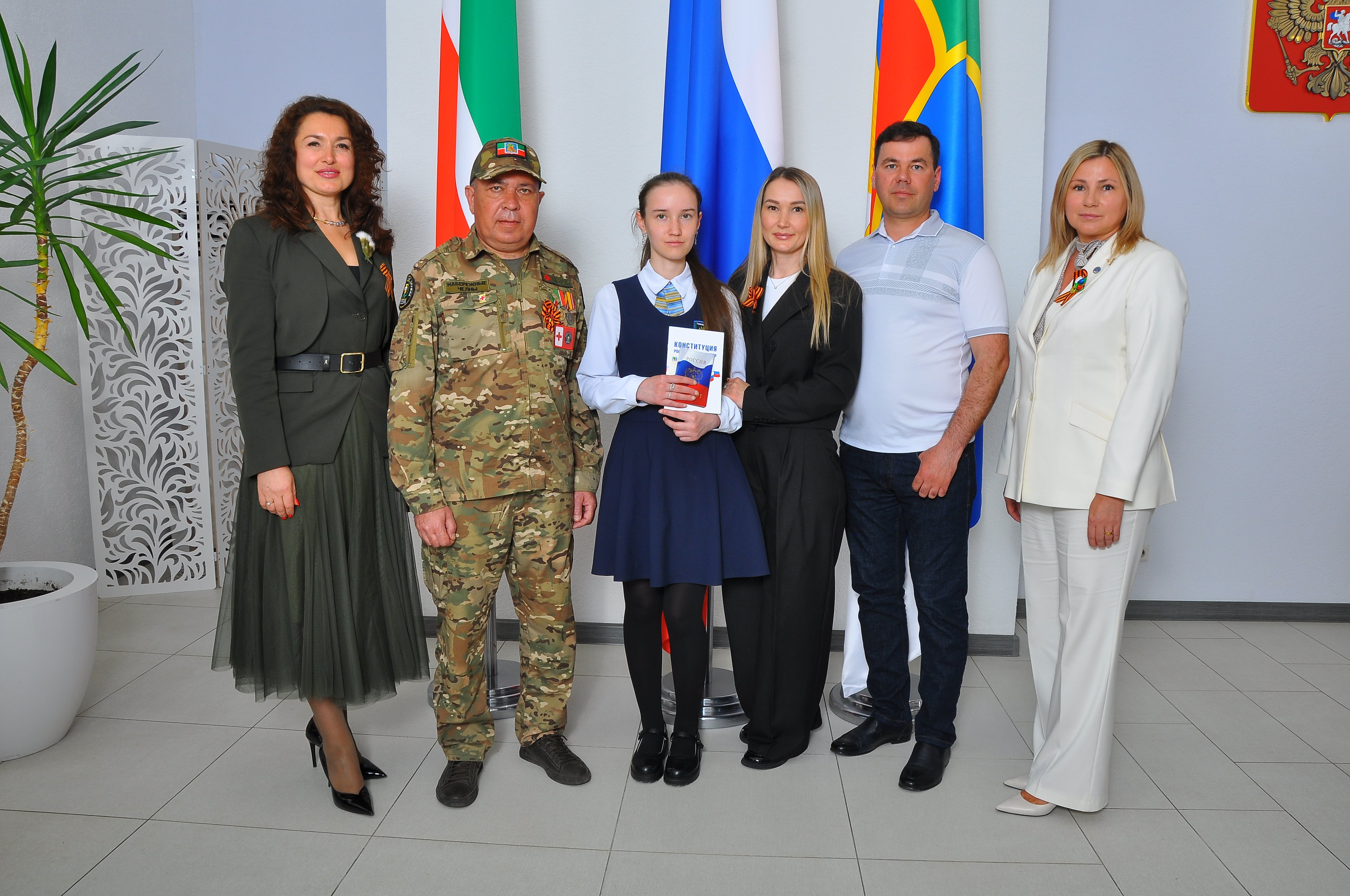 На вручении присутствовали участник специальной военной операции, начальник военно-полевого госпиталя и командир медицинской роты Марсель Хакимов и начальник Управления ЗАГС Равиля Зарипова.
