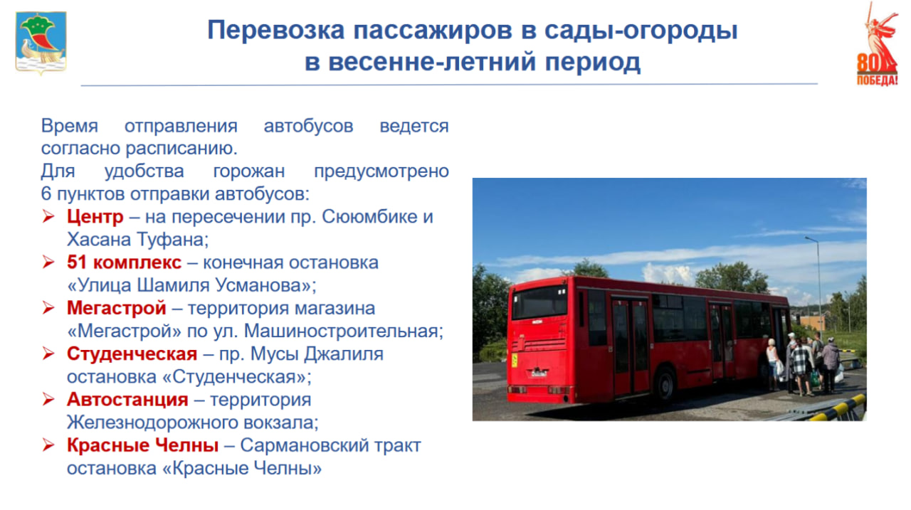 Выехать в садовые общества можно с шести точек: Центр – на пересечении проспектов Сююмбике и Хасана Туфана; 51 комплекс – конечная остановка «Улица Шамиля Усманова»; Мегастрой – территория магазина «Мегастрой» по улице Машиностроительная; Студенческая – проспект Мусы Джалиля, остановка «Студенческая»; Автостанция – территория Железнодорожного вокзала; Красные Челны – Сармановский тракт, остановка «Красные Челны».