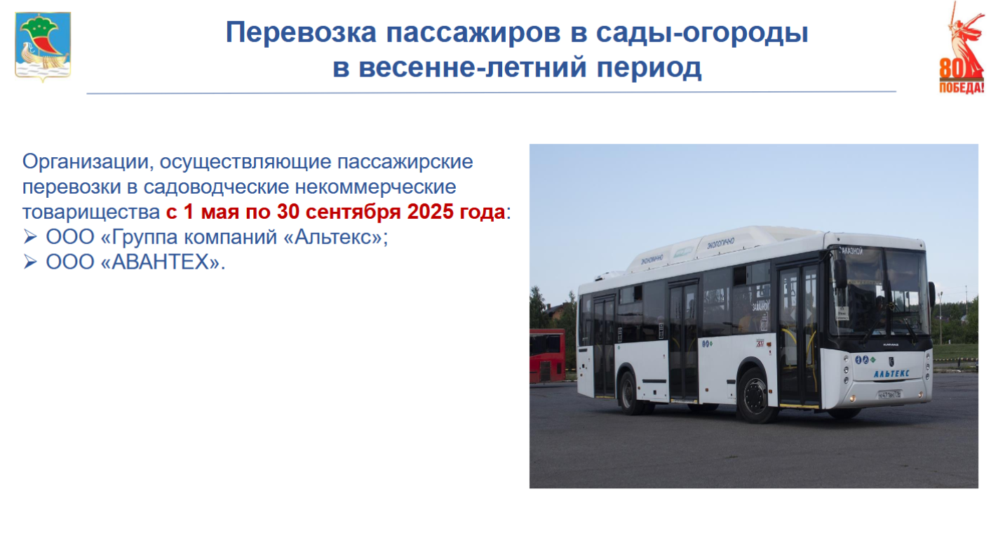 С 1 мая по 30 сентября автобусы будут курсировать по 38 маршрутам в 83 садоводческие общества. Перевозку осуществляют две компании – «Альтекс» и «АВАНТЕХ». На эти цели выделено 20 млн рублей.