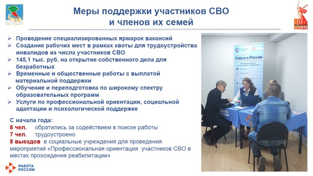 Начальник департамента Центра занятости Татьяна Быданова подчеркнула, что особое внимание уделяется участникам СВО и членам их семей: «Проводятся специализированные ярмарки вакансий, создаются рабочи5 мест в рамках квоты для трудоустройства инвалидов из числа участников СВО, выделяется 145,1 тыс. рублей на открытие собственного дела для безработных, организованы временные и общественные работы с выплатой материальной поддержки, обучение и переподготовка по широкому спектру образовательных программ, услуги по профессиональной ориентации, социальной адаптации и психологической поддержке». Так с начала года 8 человек обратились за содействием в поиске работы, трудоустроены 7 человек, проведено 8 выездов в социальные учреждения для проведения мероприятий «Профессиональная ориентация участников СВО в местах прохождения реабилитации».