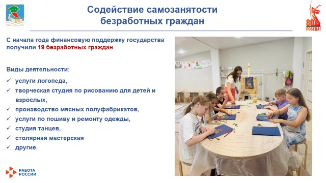 В рамках содействия самозанятости безработных граждан с начала года финансовую поддержку государства получили 19 человек на следующие виды деятельности: услуги логопеда, творческая студия по рисованию для детей и взрослых, производство мясных полуфабрикатов, услуги по пошиву и ремонту одежды, студия танцев, столярная мастерская и другие.