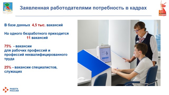 Большая часть – 75% – вакансии для рабочих профессий и профессий неквалифицированного труда, 25% – вакансии специалистов, служащих.