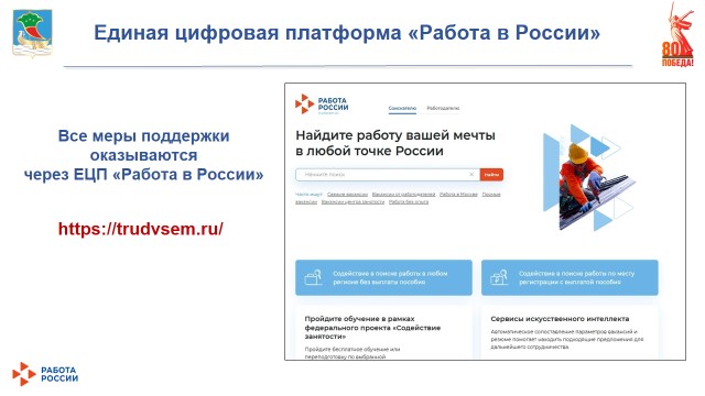 Государственные услуги по содействию гражданам в поиске подходящей работы, работодателям в подборе необходимых работников оказываются через единую цифровую платформу «Работа в России» trudvsem.ru.
