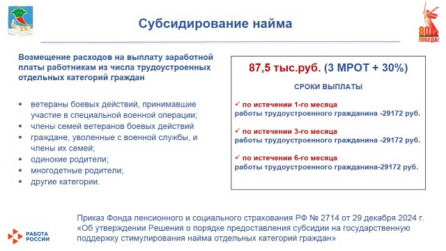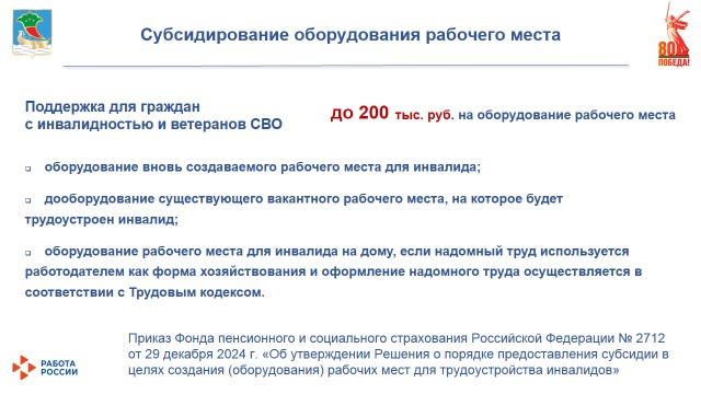 Кроме того, с этого года запущено субсидирование оборудования рабочего места для граждан с инвалидностью и ветеранов СВО: предприятие может получить до 200 тыс. рублей на расходы по оборудованию рабочего места с учетом особенностей здоровья кандидата. Эта мера стала частью нацпроекта «Кадры».