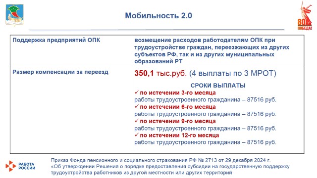 Действующим законодательством предусмотрены механизмы поддержки работодателей ОПК, привлекающих работников из другой местности, размер компенсации за переезд составляет 350,1 тыс. рублей.