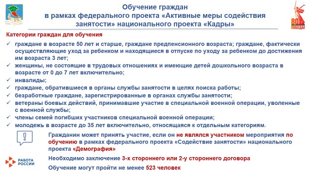 Татьяна Быданова напомнила об обучении граждан в рамках федерального проекта «Активные меры содействия занятости» национального проекта «Кадры» по трехстороннему или двустороннему договору для: «Граждан в возрасте 50 лет и старше; граждан предпенсионного возраста; граждан, фактически осуществляющих уход за ребенком и находящихся в отпуске по уходу за ребенком до достижения им возраста 3 лет; женщин, не состоящих в трудовых отношениях и имеющих детей дошкольного возраста в возрасте от 0 до 7 лет включительно; инвалидов; граждан, обратившихся в органы службы занятости в целях поиска работы; безработных граждан, зарегистрированных в органах службы занятости; ветеранов боевых действий, принимавших участие в специальной военной операции, уволенных с военной службы; членов семей погибших участников специальной военной операции; молодежи в возрасте до 35 лет включительно, относящейся к отдельным категориям». Обучение могут пройти не менее 523 человек.