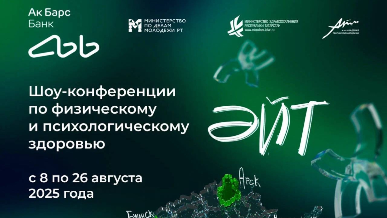 С 8 по 26 августа в шести городах Татарстана пройдет масштабный проект «ӘЙТ» («Скажи») о физическом и психологическом здоровье молодежи. Финальное мероприятие состоится 26 августа в Набережных Челнах на площадке Дворца культуры «Энергетик».