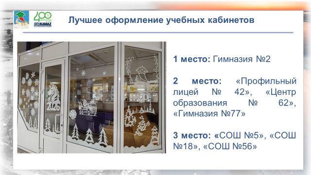 В номинации «Оформление учебных кабинетов» первое место заняла гимназия №2, на втором месте «Профильный лицей №42», «Центр образования №62» и гимназия №77, на третьем месте школы №№5,18, 56. В номинации «Лучшее оформление фойе, актовых и спортивных залов» лучшими признаны коллективы гимназии №57, второе место у школ №4 и №7, третье место у Центра образования №16, шко №25 и №41.