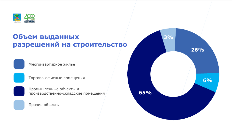 Наибольшая доля выданных разрешений на строительство приходится на промышленные объекты и производственно-складские помещения – 65%, многоквартирное жилье – 26%, торгово-офисные помещения – 6%, на прочие объекты – 3%.