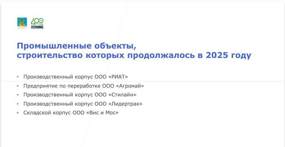 В 2025 году продолжилось строительство пяти промышленных объектов: производственно-логистического центра компании «РИАТ», предприятия по переработке технических культур фирмы «Агромай», производственного корпуса компании «Стилайн», производственного здания фирмы «Лидертрак» и складского корпуса компании «Вис и Мос».