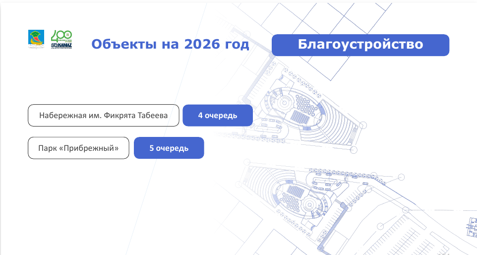 В 2026 году планируется продолжение благоустройства  набережной им. Фикрята Табеева (4 очередь) и парка «Прибрежный».