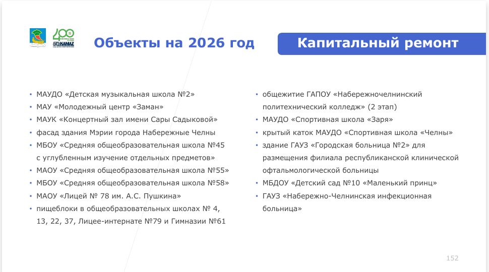 В рамках реализации федеральных и республиканских программ планируется капитальный ремонт объектов социальной инфраструктуры и благоустройство общественных пространств города. По республиканским программам планируется капитальный ремонт объектов образования: детской музыкальной школы №2, молодежного центра «Заман»,  школ №№ 45, 55, 58 и лицея № 78 им. А.С. Пушкина,  пищеблоков школ №№ 4, 13, 22, 37, лицея-интерната № 79 и гимназии № 61, общежития Набережночелнинского политехнического колледжа (2 этап),  спортивной школы «Заря», крытого катка спортивной школы «Челны» и  детского сада №10 «Маленький принц».