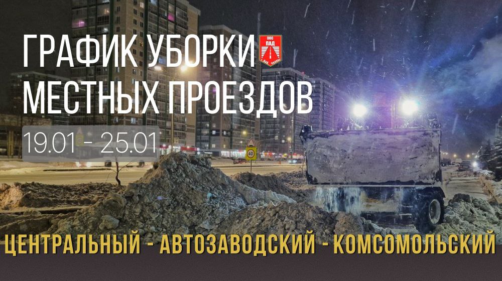 График уборки местных проездов в Комсомольском районе: 19 января – Сармановский тракт, 17А комплекс; 20 января – Сармановский тракт, 17А комплекс III-1; 21 января – бульвар Бумажников 17А; 22 января – ул. Тан, 19 комплекс; 23 января – ул. Аркылы; 24 января – пр. Фоменко, 20 комплекс; 25 января – пр. Фоменко, 21 комплекс.