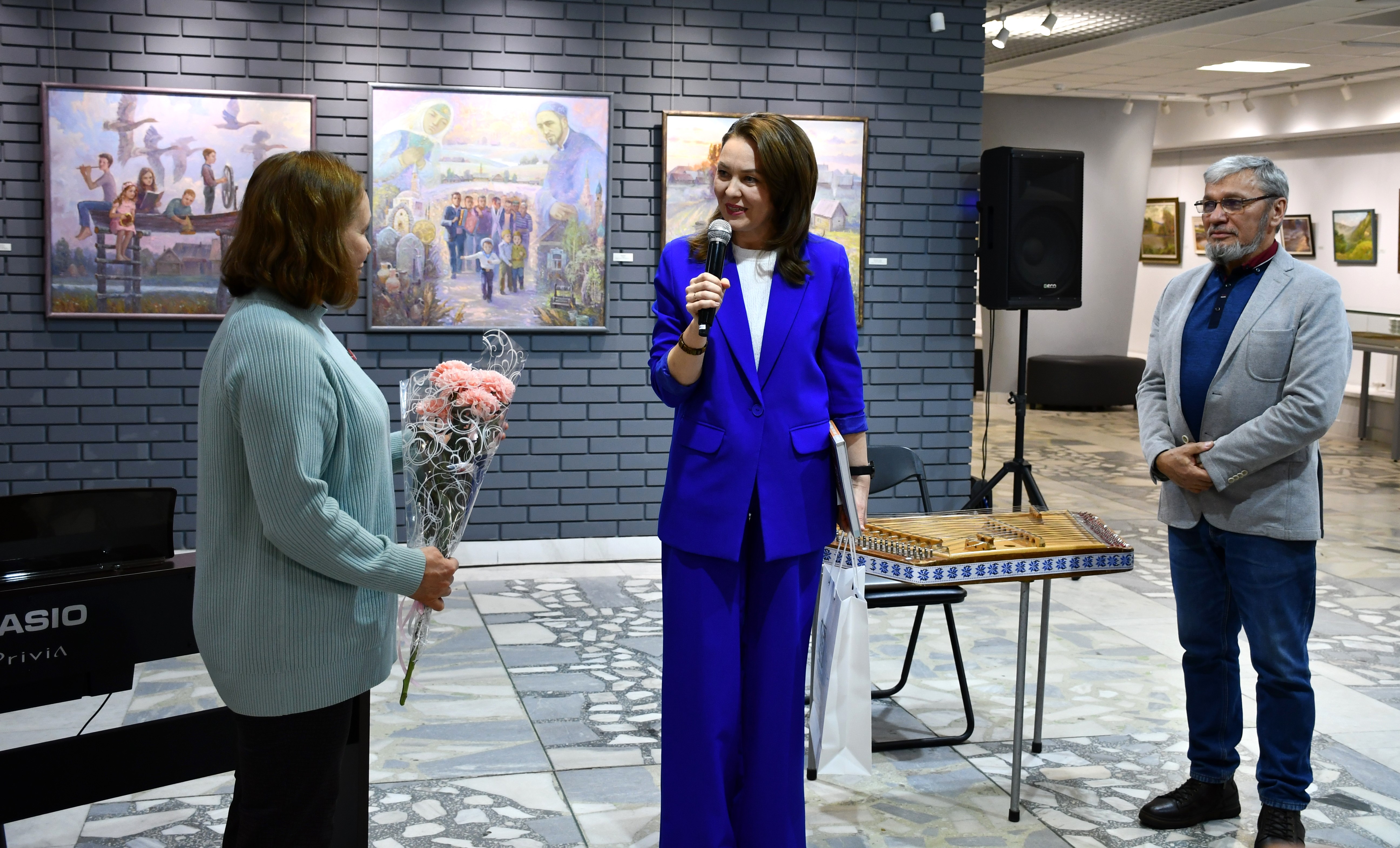Открытие прошло в теплой, дружеской обстановке. С приветственным словом выступила директор картинной галереи Ильсия Загидуллина. Слова поздравления и поддержки выразили коллеги по цеху, художники разных городов республики. Музыкальный подарок прозвучал в исполнении преподавателей Детской музыкальной школы №3 Елены Богданович и Натальи Уруковой.