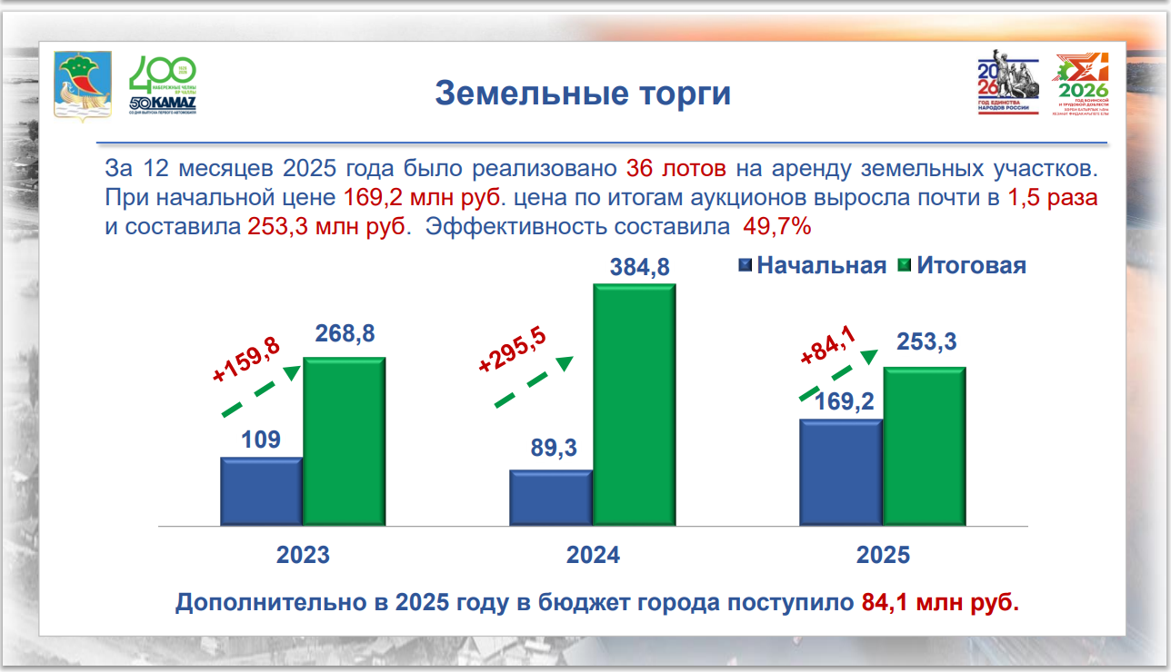 За 12 месяцев 2025 года было реализовано 36 лотов на аренду земельных участков. При начальной цене 169,2 млн рублей цена по итогам аукционов выросла в 1,5 раза и составила 253,3 млн рублей, дополнительно в бюджет поступило 84,1 млн рублей.