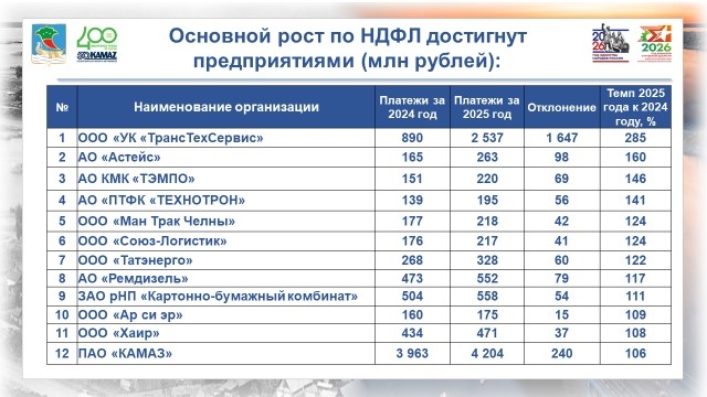 Особую роль сыграли резиденты территории опережающего развития (ТОР): от 50 резидентов поступило 519 млн рублей по НДФЛ (рост к 2024 году – 134 млн рублей); в консолидированный бюджет Республики Татарстан резиденты перечислили 1 млрд 887 млн рублей по этому налогу.
