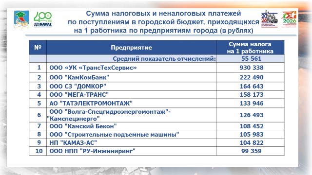 Анализ работы 100 бюджетообразующих предприятий города показал положительную динамику налоговой отдачи, отметила начальник управления финансов Светлана Мулюкова. В 2025 году объём налоговых и неналоговых платежей в расчёте на одного работника вырос на 17% по сравнению с 2024 годом и достиг 56 тыс. рублей.
