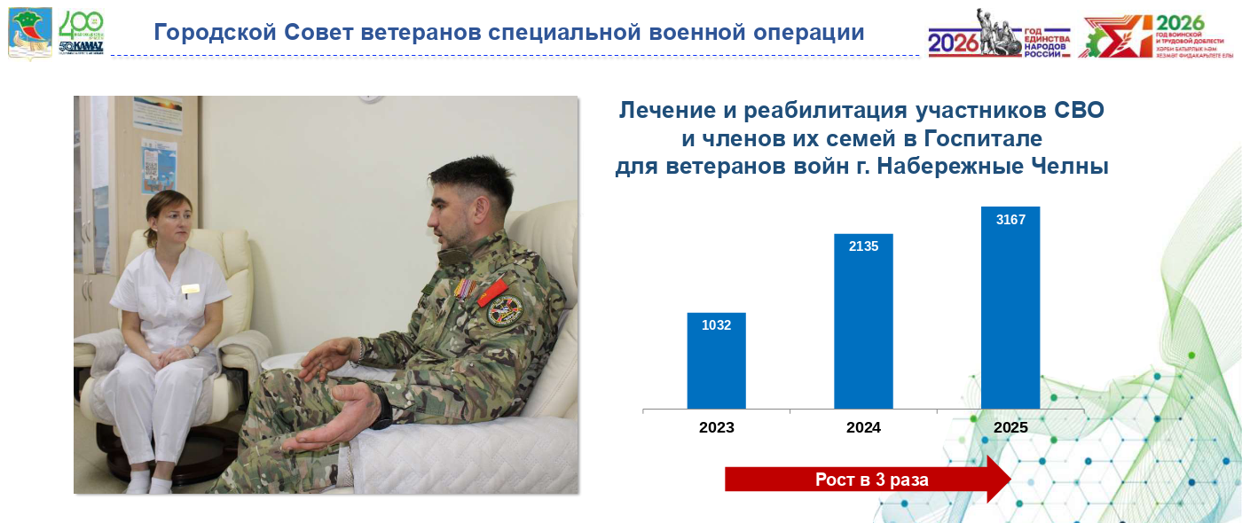 Приоритетной задачей организации остается здоровье бойцов. По словам Шамиля Аюпова, нагрузка на медицинские учреждения растет: в прошлом году в Госпиталь для ветеранов войн обратилось более 3 тысяч участников СВО и членов их семей, что в 1,5 раза превышает показатели 2024 года. Отметим, что с 2023 года рост произошел в три раза.