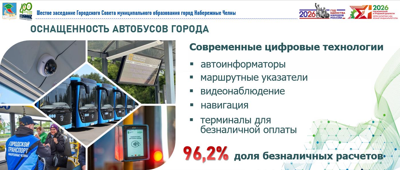 Благодаря поддержке республики и КАМАЗа создана новая инфраструктура для автобусов. Внедряются цифровые технологии для управления транспортом, доля безналичной оплаты превышает 96%.