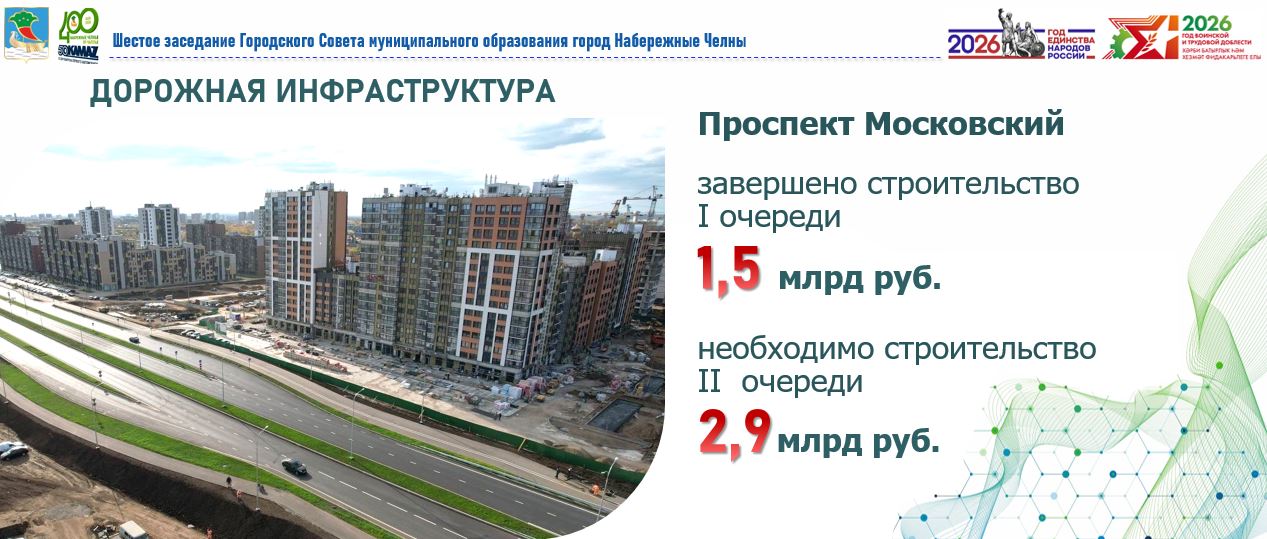 Ежегодно выделяются значительные средства на дорожную инфраструктуру. В 2025 году отремонтированы ключевые магистрали. В 2026 году запланирован ремонт проспектов Мира, Мусы Джалиля и Набережночелнинского. Также ведется работа над строительством второй очереди Московского проспекта для новых микрорайонов.