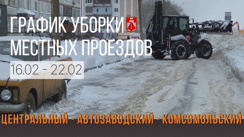 График уборки местных проездов в Автозаводском районе: 16 февраля – 53 комплекс (сквозной проезд от пр. Московского до 40 лет Победы, вдоль рынка); 17 февраля – 53 комплекс (сквозной проезд от пр. Московского до 40 лет Победы, между 53/22 и 53/31); 18 февраля – ул. Аделя Кутуя (от школы №42 до ул. Виктора Полякова); 19 февраля – два заезда от пр. Абдурахмана Абсалямова до ул. Аделя Кутуя 20 февраля – бульвар Шишкинский (от пр. Московского до пр. Вахитова); 21 февраля – пр. Московский, 4 и 5 комплексы; 22 февраля – пр. Мира, 28 комплекс.