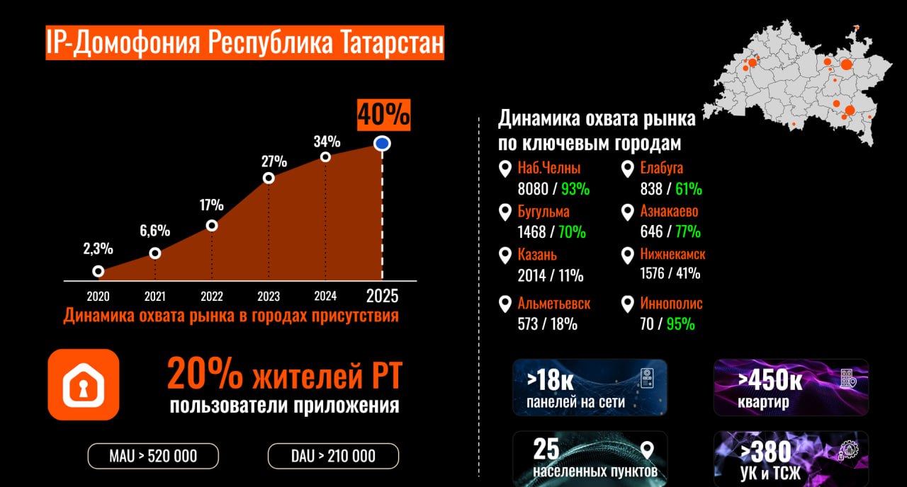 Отметим, что сегодня Набережные Челны являются одним из пионеров в Татарстане в направлении IP-домофонии: установлено свыше восьми тысяч панелей умных домофонов, это 93% охвата домов с IP-домофонией.