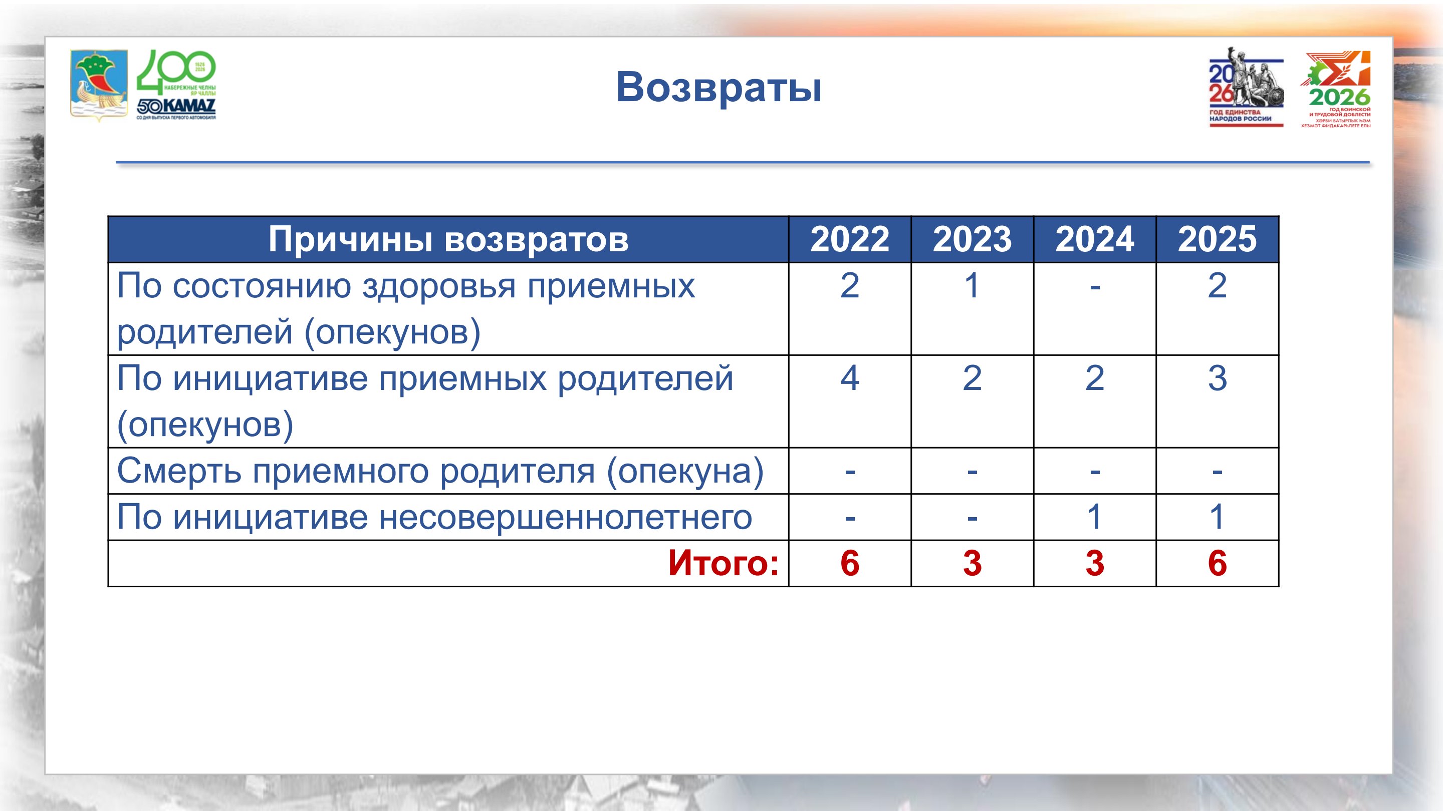 В то же время в прошлом году зафиксировано шесть отказов опекунов от выполнения обязанностей, из них: по инициативе несовершеннолетнего – 1, по инициативе опекунов – 3, по состоянию здоровья опекуна – 2.